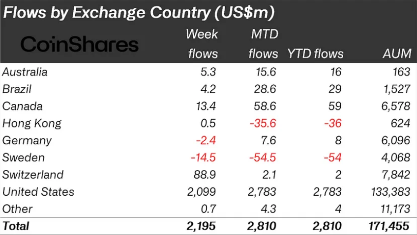 此外,美國佔據了流入的最大份額,貢獻了 20 億美元。然而,其他地區也報告了顯著的活動,瑞士和加拿大分別錄得 8900 萬美元和 1300 萬美元。