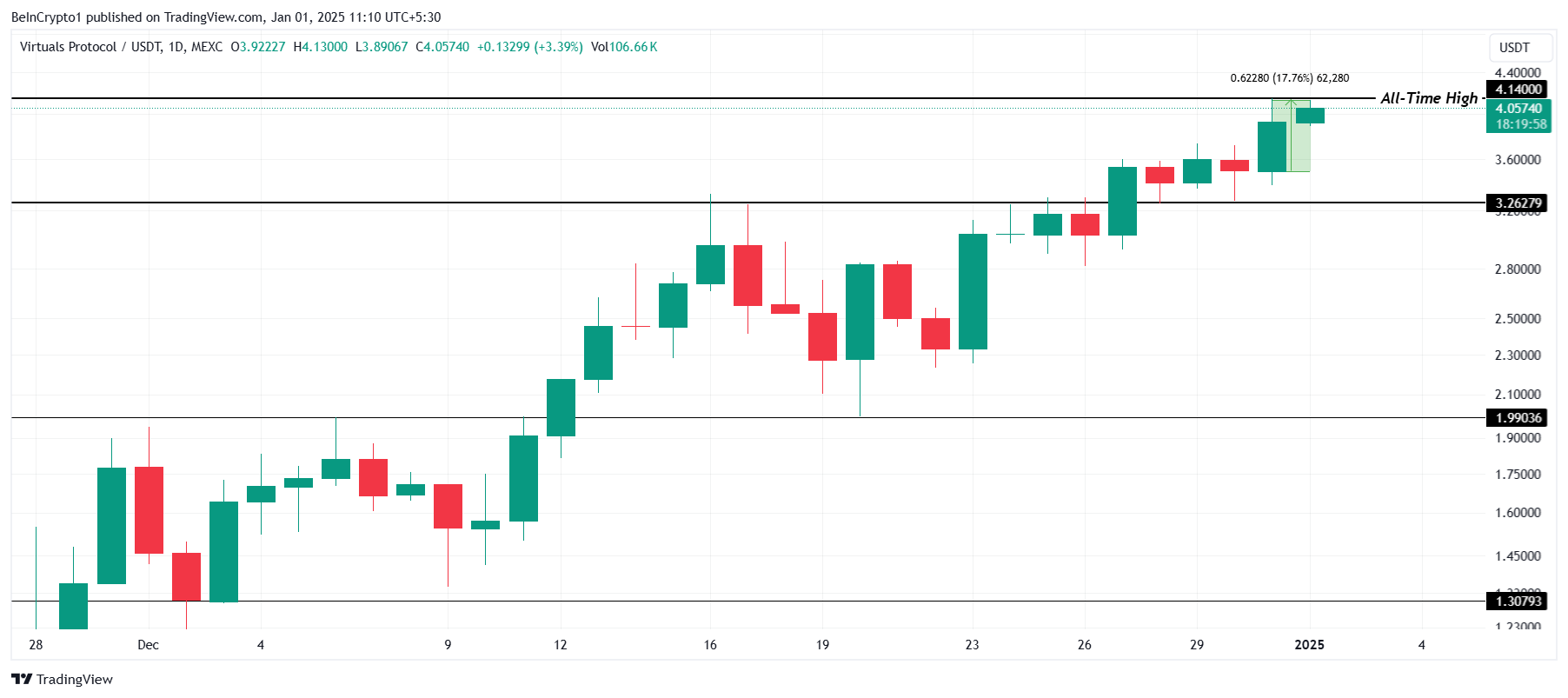 VIRTUAL 達到了新的歷史高點 4.14 美元,過去 24 小時內上漲了 17.76%。這一漲勢反映了加密市場中日益增長的看漲勢頭,使 VIRTUAL 在這波上升趨勢中成為山寨幣中的佼佼者。