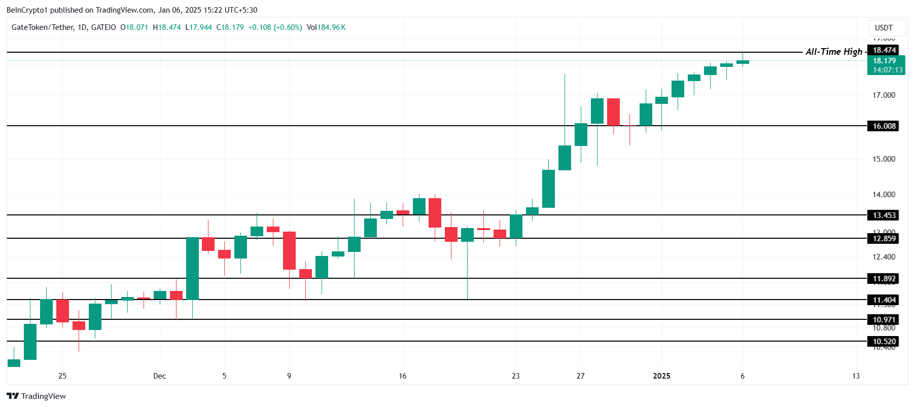 保持在 16.00 美元以上對於 GT 維持其上升趨勢至關重要。即使投資者拋售引發小幅價格回調,保持這一支撐位將使該山寨幣保持在復甦和潛在進一步增長的軌道上。