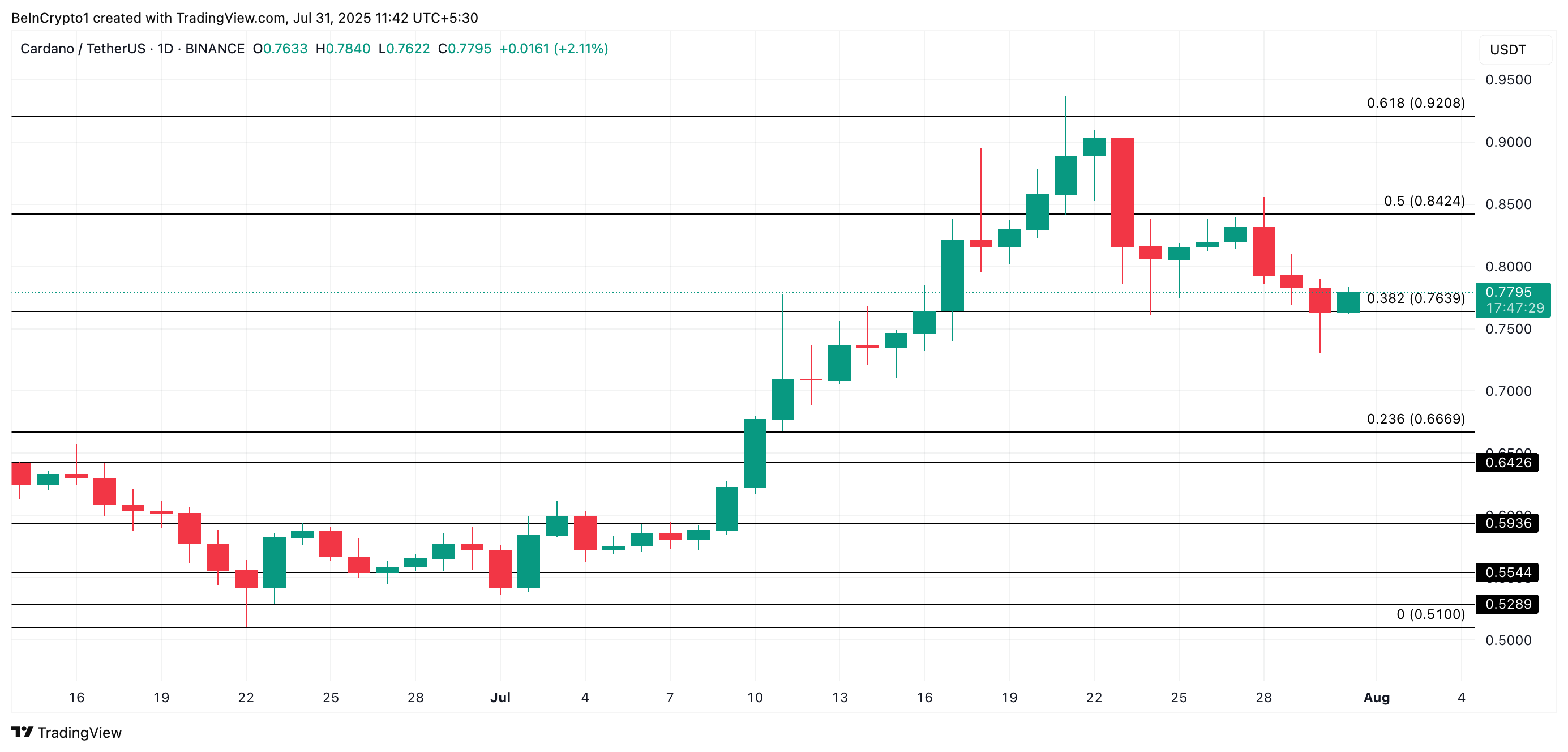 这种积累发生在 ADA 价格近期回调之际。该山寨币从 7 月 21 日的周期高点 $0.93 下滑至发稿时的 $0.77。尽管出现调整,但高净值投资者的持续兴趣表明他们对 ADA 的长期前景仍然充满信心。