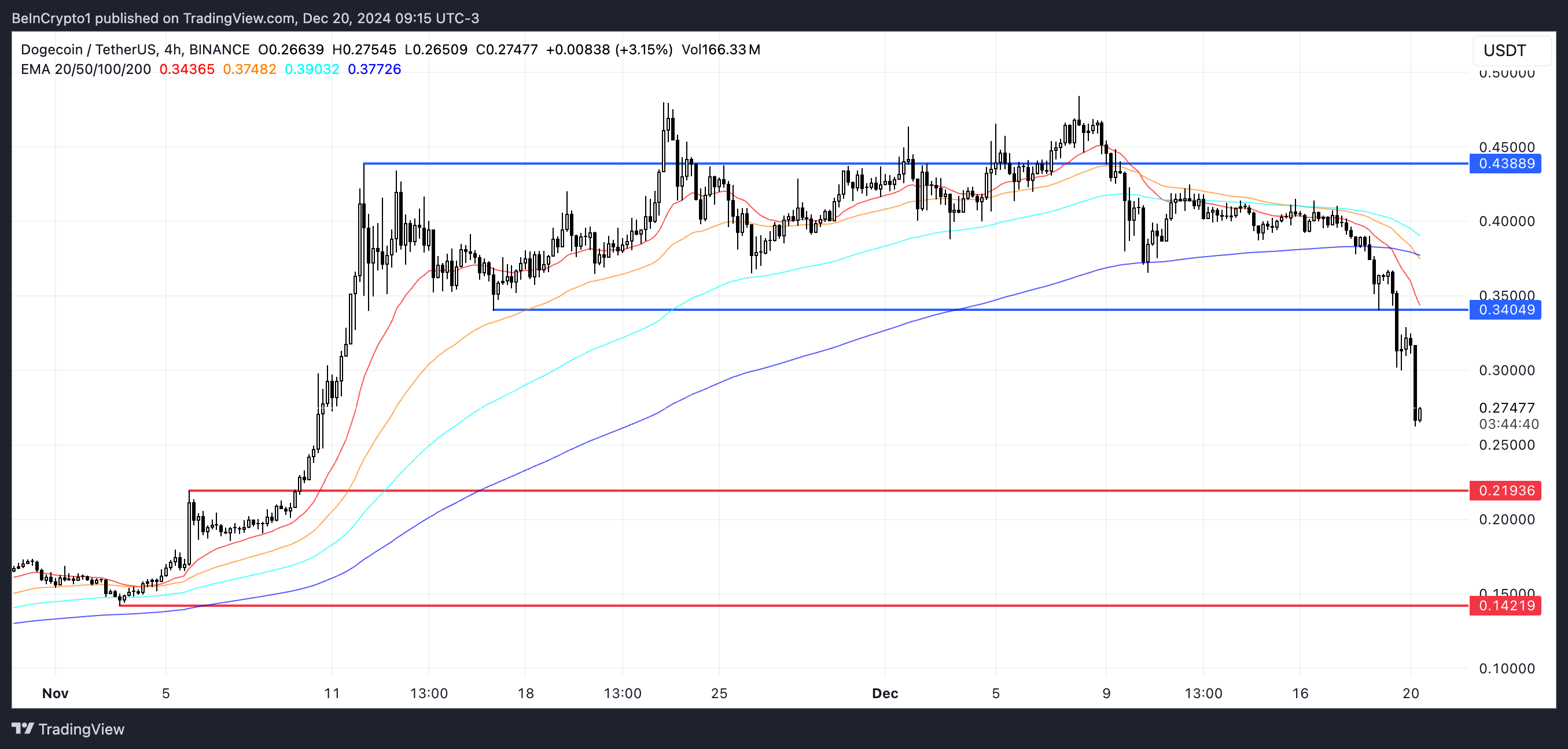 如果當前的下跌趨勢持續,DOGE價格可能繼續下跌至下一個關鍵支撐位0,219 USD。這是買家可能嘗試穩定價格的關鍵區域;然而,如果賣壓持續並突破此支撐,價格可能跌至0,14 USD。