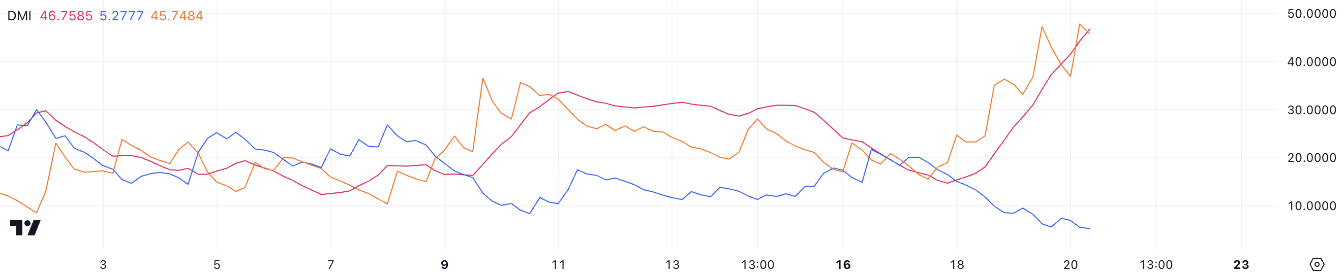 DOGE的DMI(方向性運動指數)圖表顯示當前趨勢中顯著的看跌力量。ADX(平均方向指數)值在過去三天內從14,7急升至46,7,表明趨勢強度無論方向如何都大幅增強。