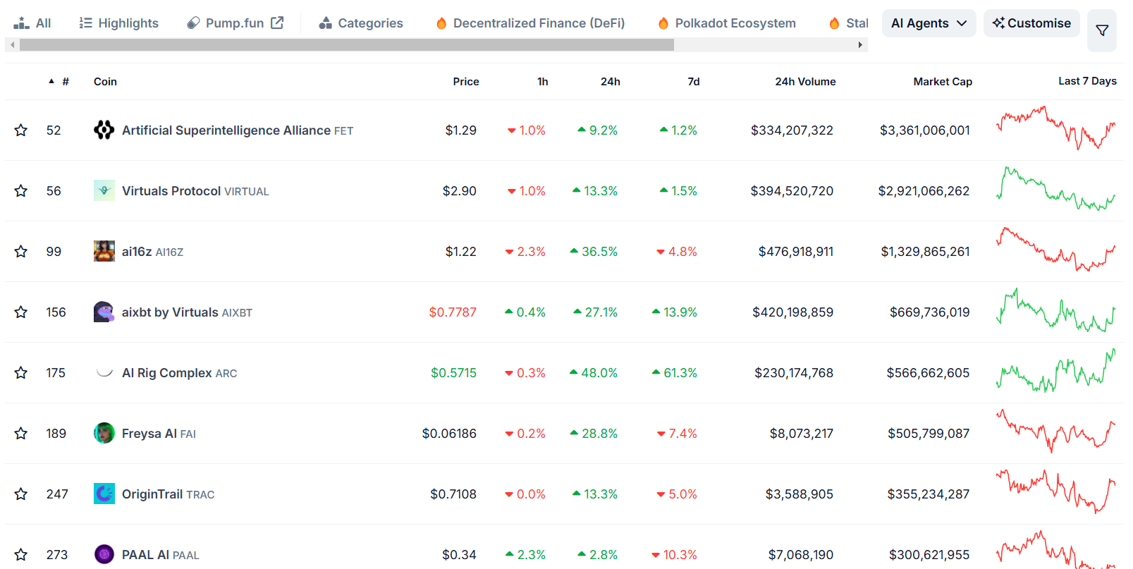 AI 代理代幣,如 Virtuals Protocol、AIXBT 和 AI16Z,均取得了顯著增長。Virtuals Protocol 在過去 24 小時內上漲超過 13%,而 AI16Z 則經歷了驚人的 36% 增長。AIXBT 代幣在同一期間上漲 27%。