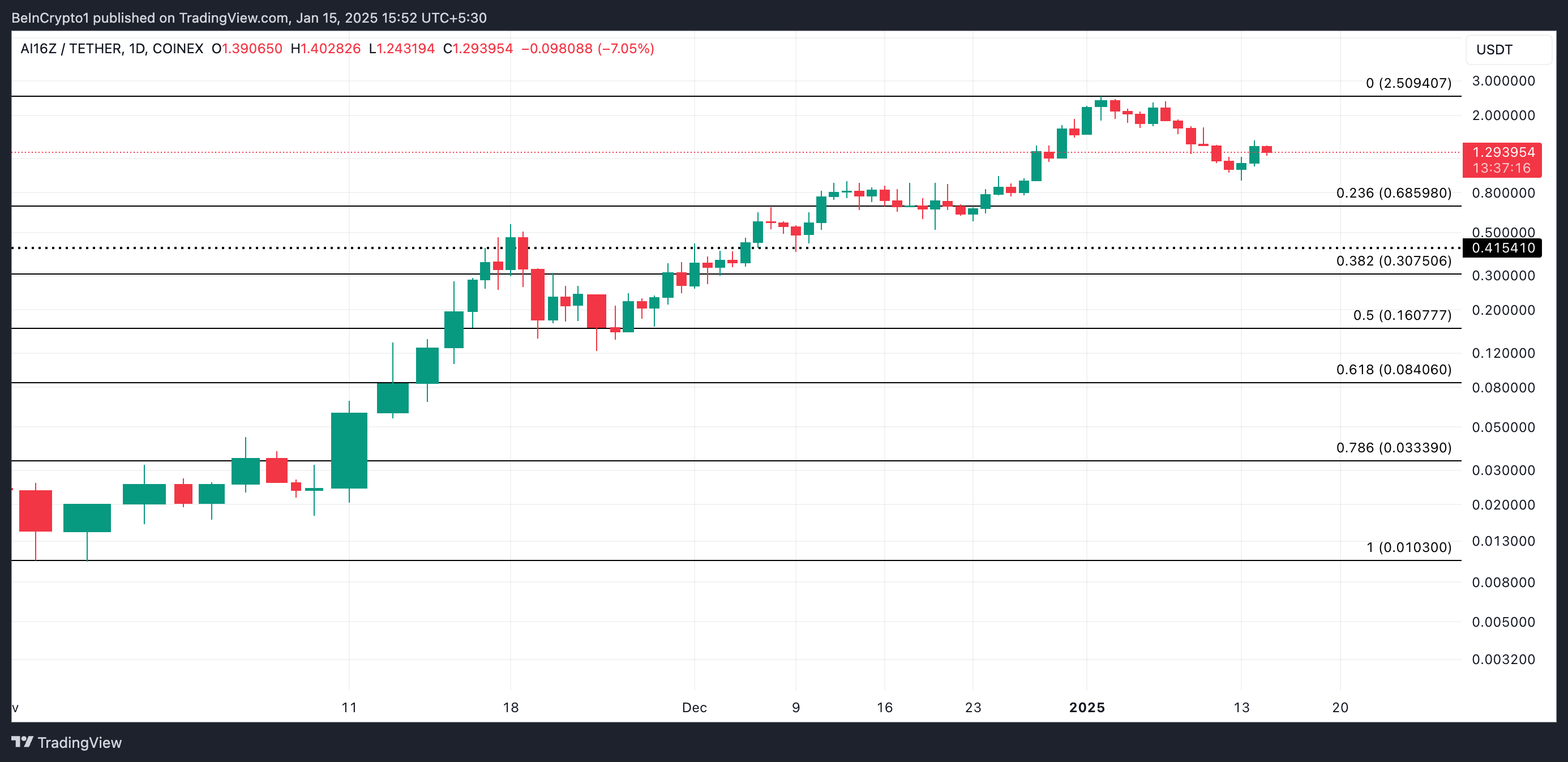 AI16Z 目前交易價格為 1.29 美元,過去 24 小時內價格上漲 9%。然而,其交易量在此期間下降 27%,反映出對該 AI 代幣的實際需求不足。