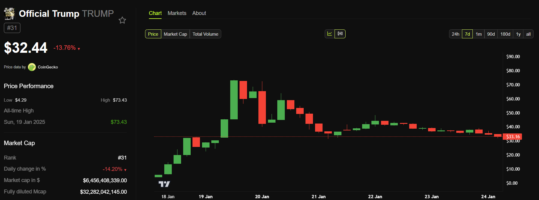 TRUMP 幣已經經歷了極端的價格波動,從不到 10 美元飆升至 75 美元,然後在發稿時回落至 32.44 美元。同樣,MELANIA 幣也經歷了相同的波動軌跡。