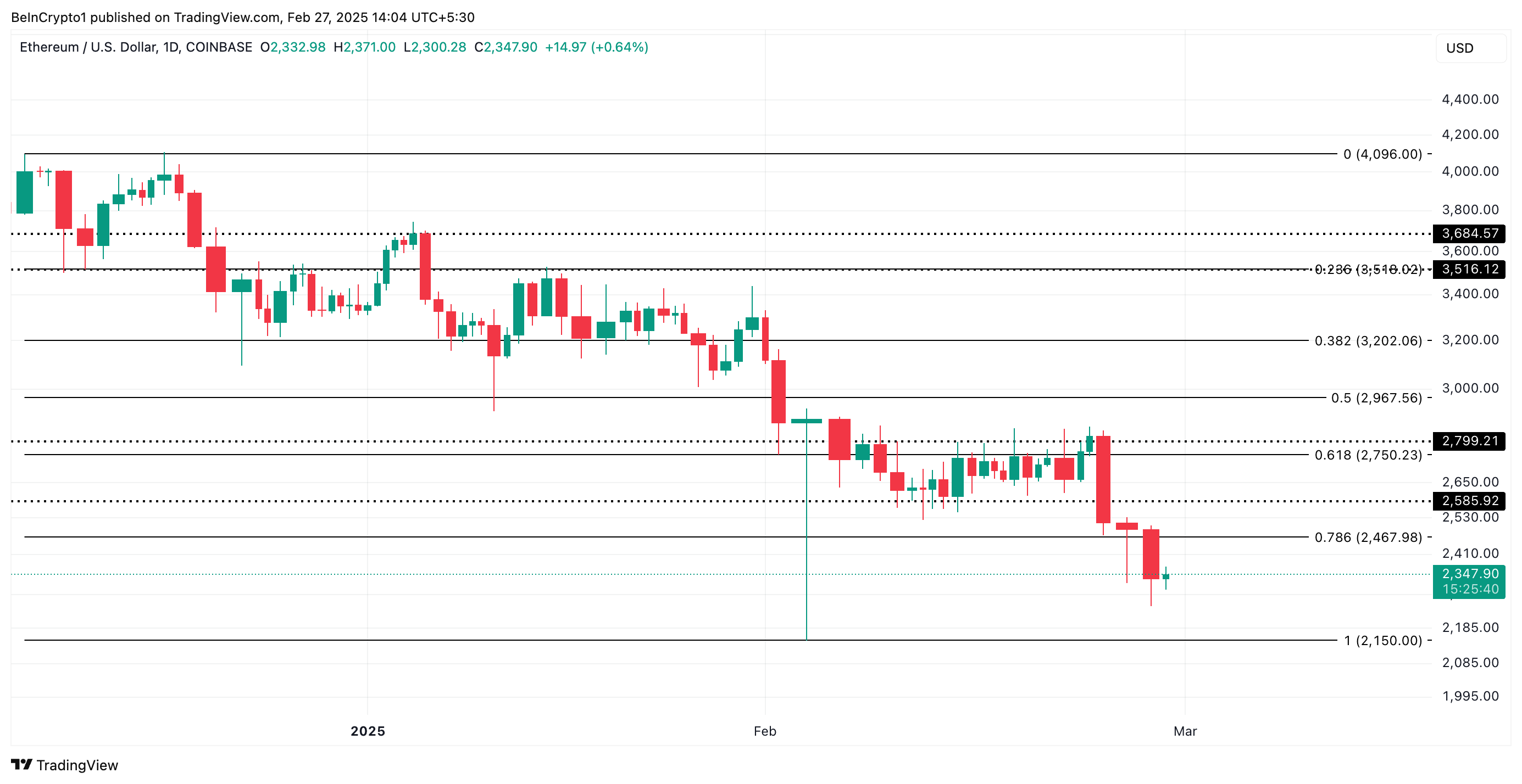 特朗普(Donald Trump)的貿易戰關稅本週引發了加密市場的顯著波動,導致以太坊價值下跌。截至發稿時,這一領先的山寨幣交易價格為 2,347 美元,這是自 11 月以來的最低點。