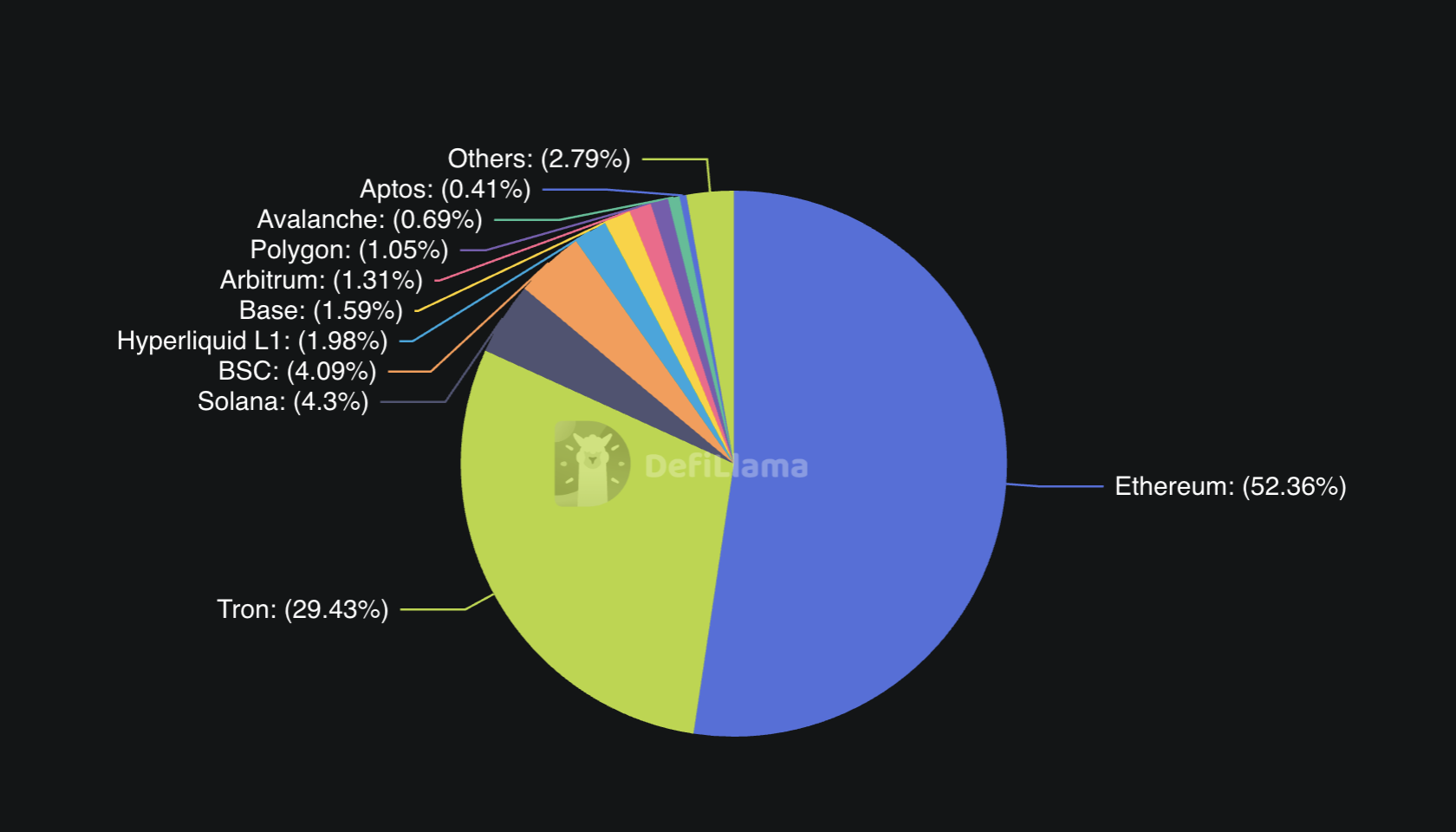 根據 DefiLlama 的最新數據,以太坊佔 2,780 億美元穩定幣市值的 52% 以上。