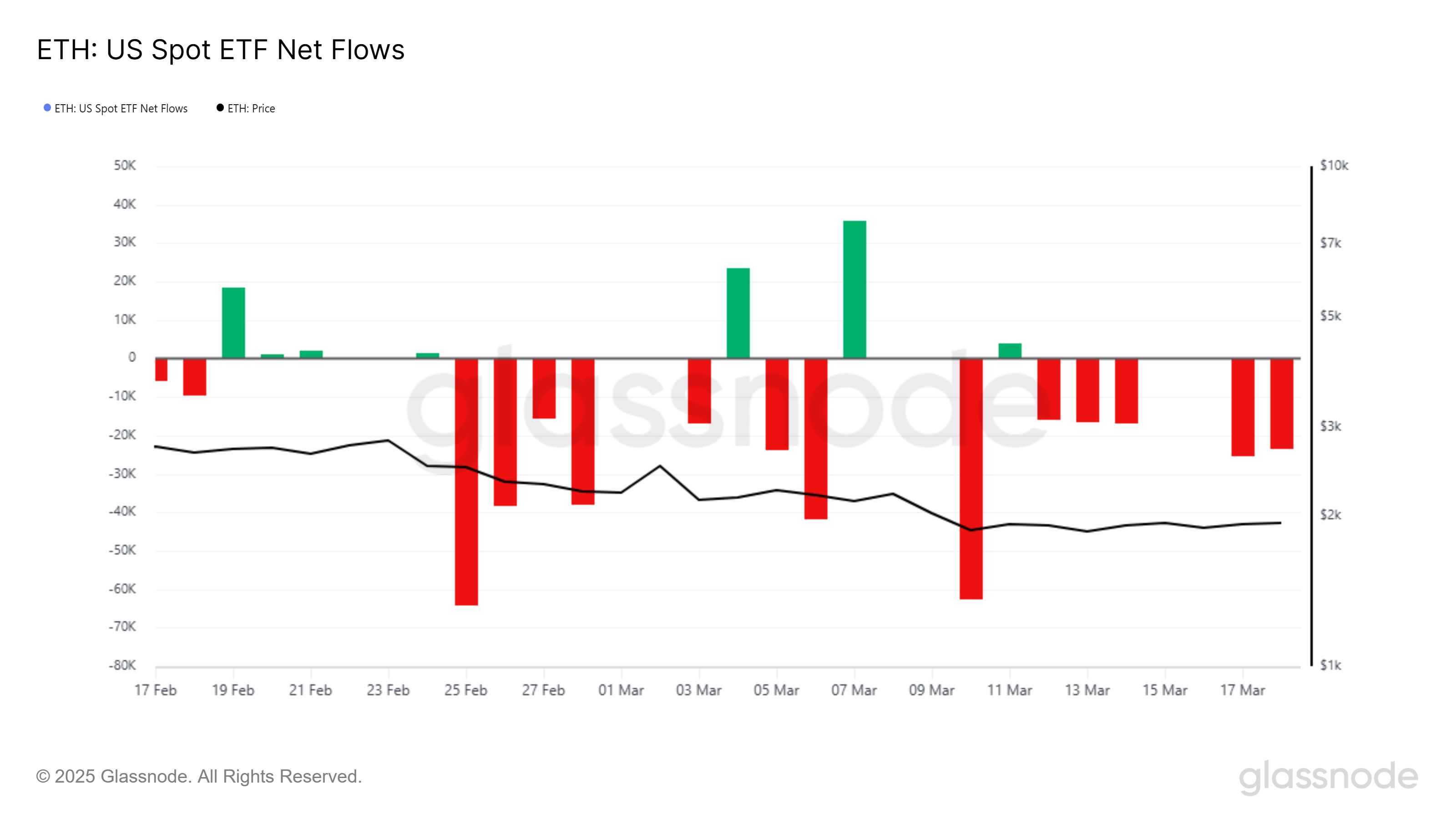 持續的資金流出反映了市場對以太坊的整體看跌情緒。儘管偶有資金流入,但遠不及流出規模。因此,市場對以太坊短期復甦的信心仍然低迷。