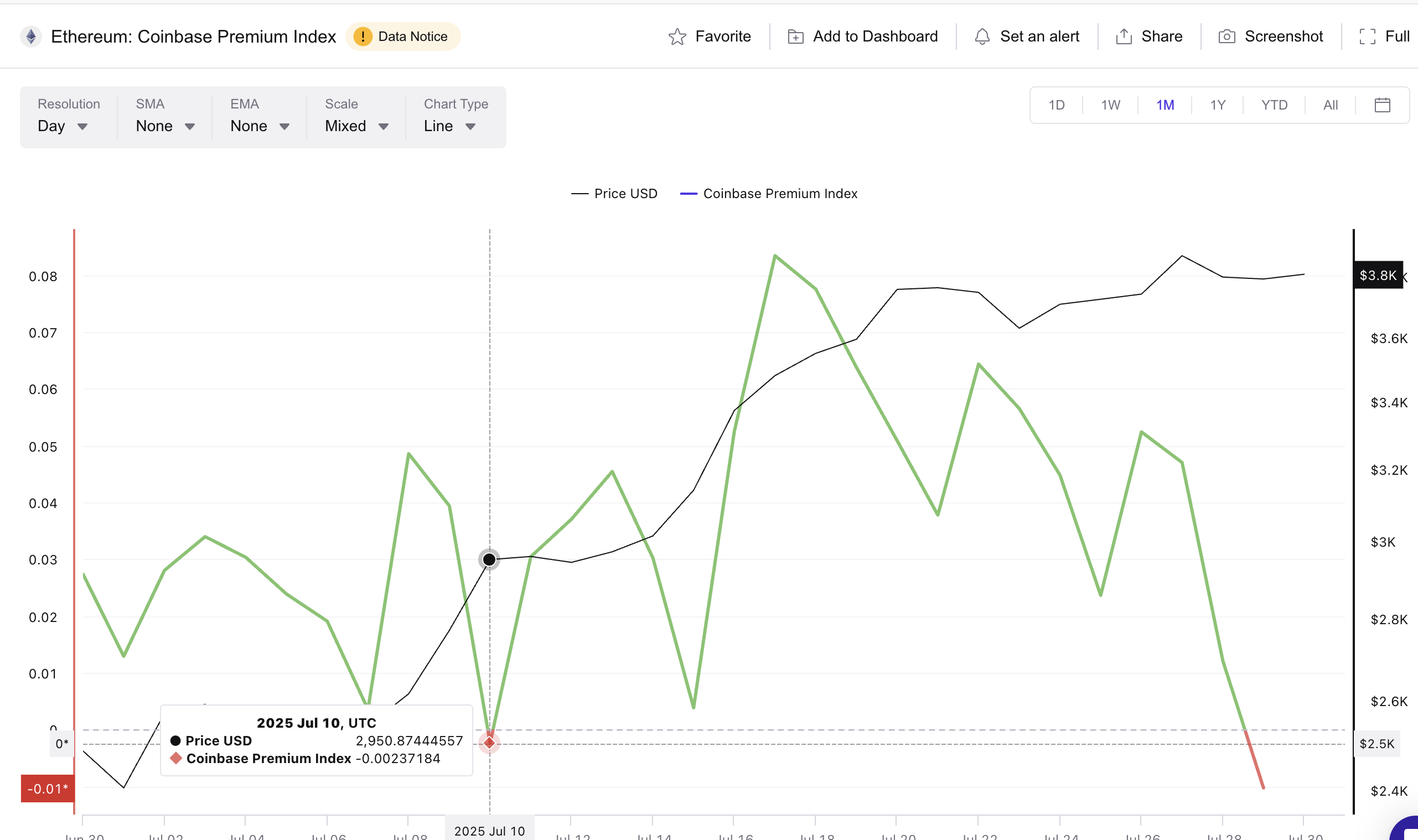 作为背景,7 月 10 日,该指数仅短暂转为负值至 -0.0023,$ETH 价格几乎没有反应。这次的下降幅度更大,表明尽管 7 月份有ETF 乐观情绪,美国买家仍在退场。
