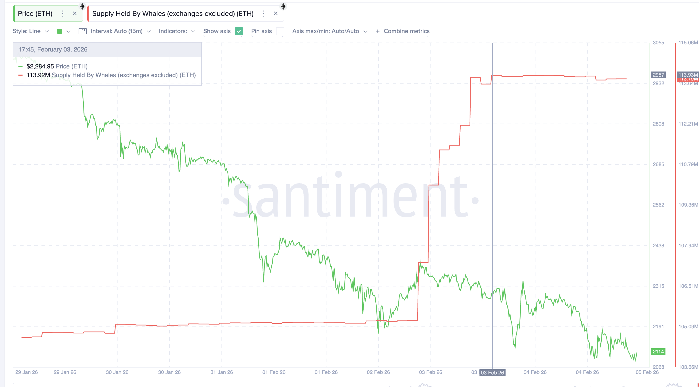 2 月 3 日,巨鲸总持仓约为 1,393 万枚 $ETH。此后,该数据降至约 1,379 万枚 $ETH,减少约 14 万枚 $ETH,按市值计算超过 2.9 亿美元。这一变化表明,市场更多呈现谨慎分散的态度,而非充满信心的长期加仓。