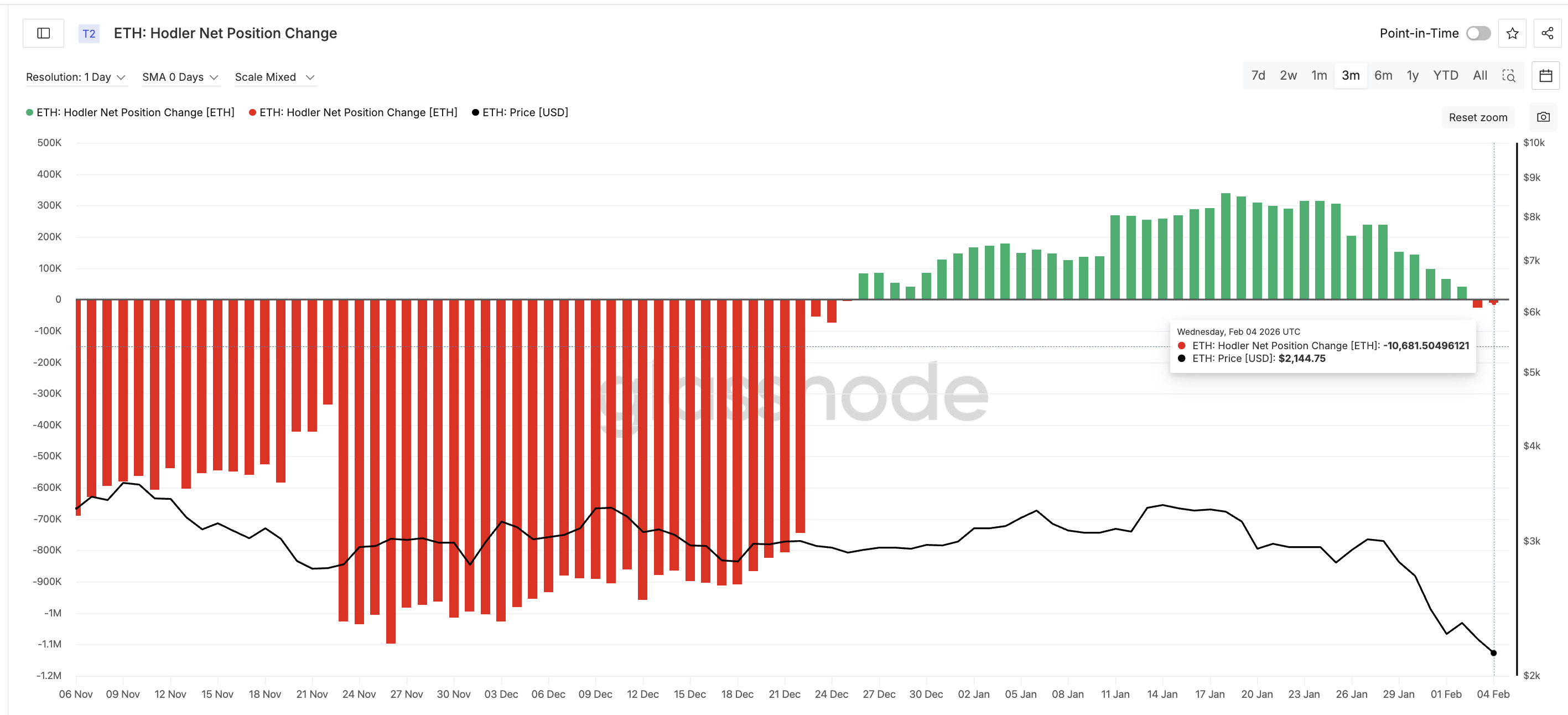 2 月初以来,随着链上和技术指标显示抛压升温,以太坊价格维持在低位震荡。该币种已跌破多个关键支撑位,近期数据显示,大户与长期持有者正逐步减持,市场情绪趋于谨慎。