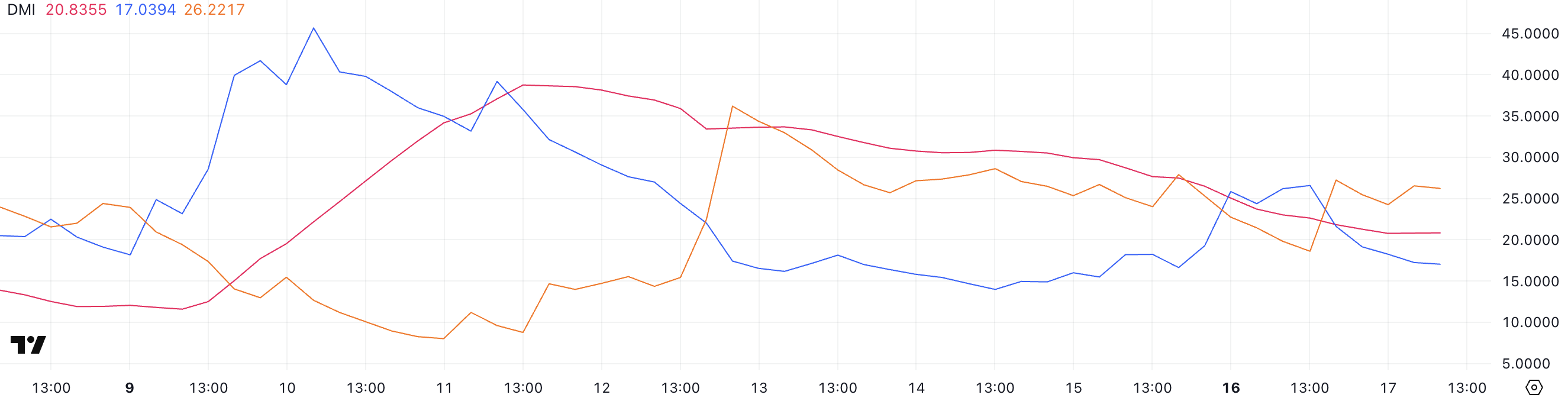 从方向性指标来看,以太坊的 +DI 从昨天的 26.57 降至 17,此前曾短暂从两天前的 16.62 上升。这表明多头压力迅速降温。