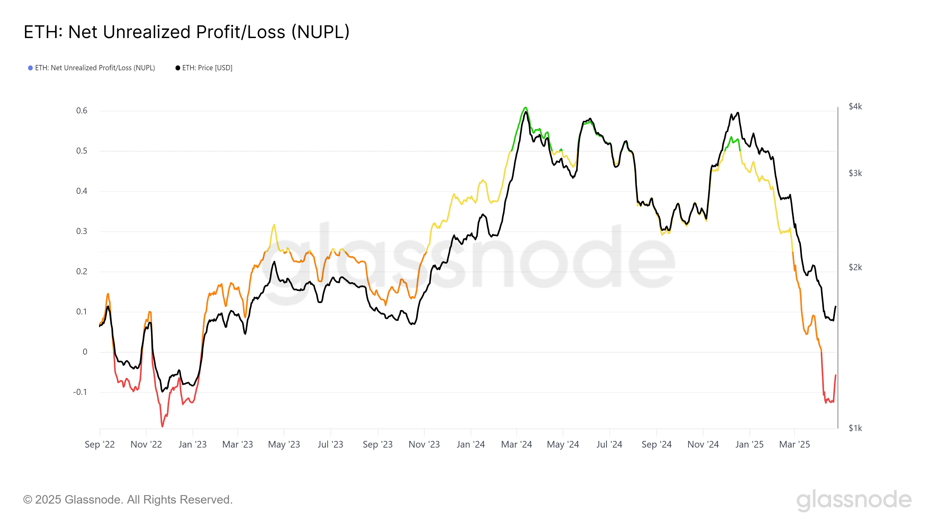 以太坊網絡的價值和用戶活動顯示出可能復甦的跡象,但目前的市場情緒仍然承受壓力。淨未實現盈虧(NUPL)指標,衡量流通中幣的整體盈虧,已進入投降階段。