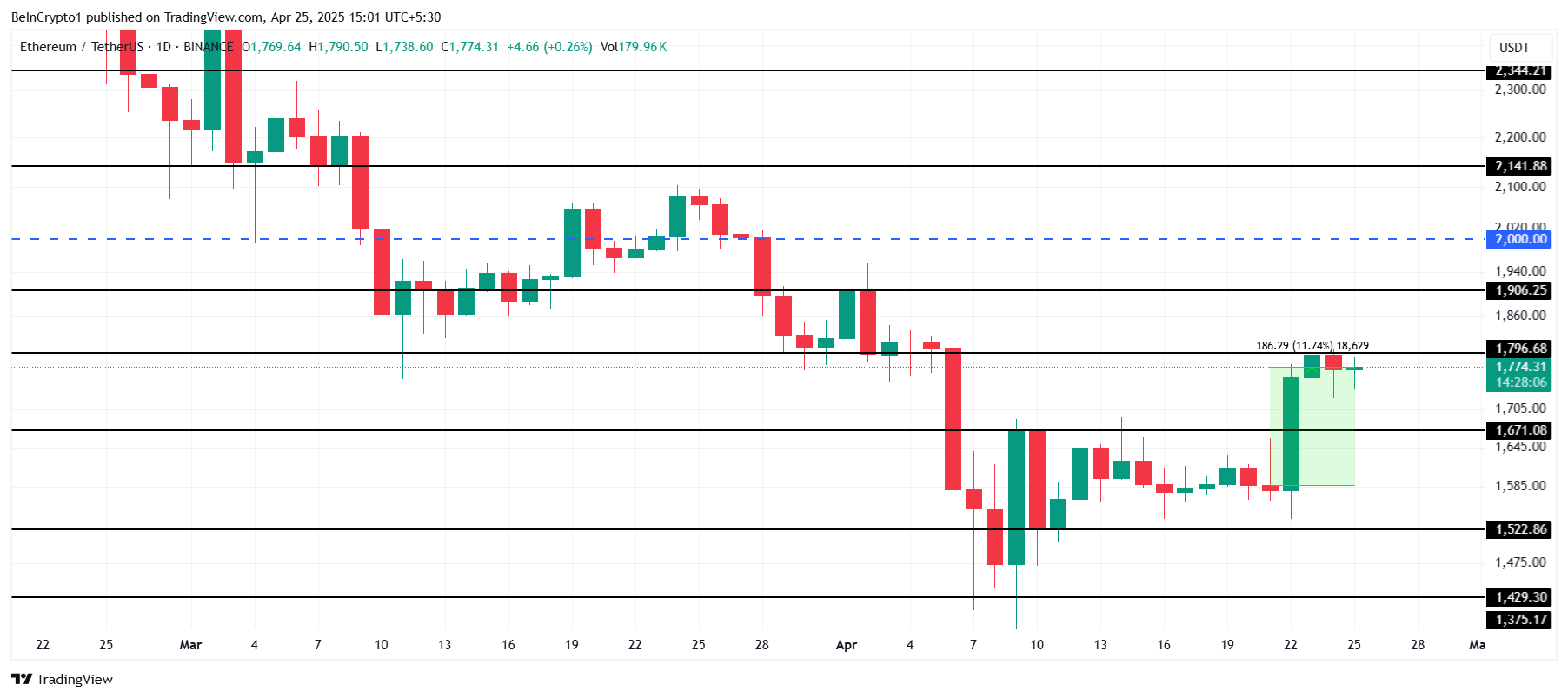 以太坊的價格在過去一週上漲了 11%,目前交易價格為 1,774 美元。它正測試 1,796 美元的阻力位,突破此關鍵點對以太坊持續回升至 2,000 美元大關至關重要。若成功突破此阻力,將顯示回升趨勢的延續,推動以太坊接近其先前高點。
