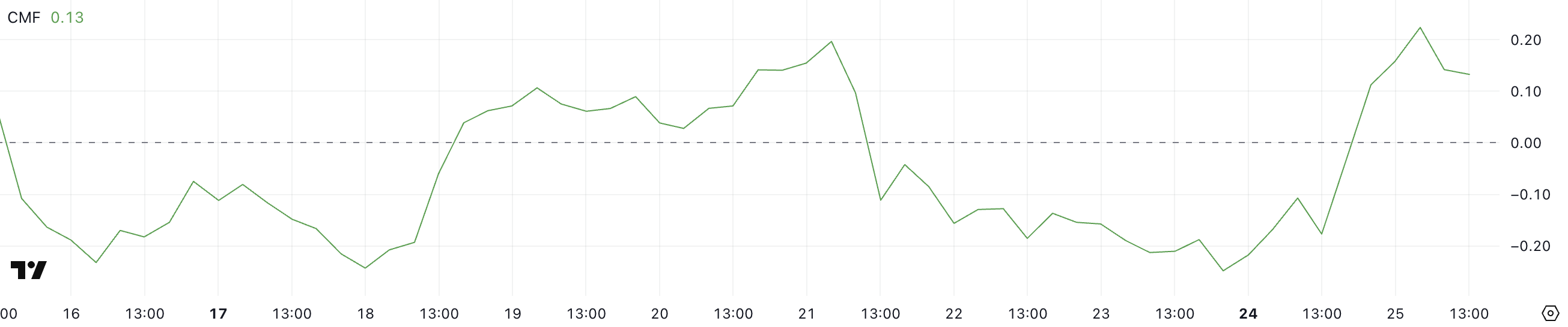 正值的蔡金資金流量指標顯示買家仍掌控局勢,支持價格持續上漲的可能性。然而,從 0.22 降至 0.13 顯示買壓正在減弱。