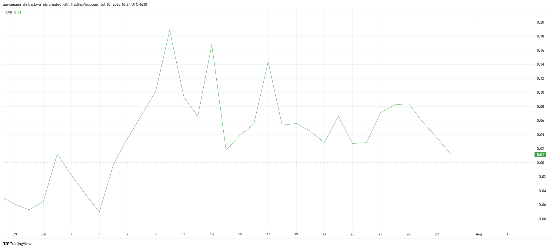 目前,$HBAR 的 Chaikin 资金流量指标(CMF)接近 4 周低点,接近零线。这表明投资者资金流出占据主导地位,积累转向抛售的趋势显著。如果 CMF 跌破零线,将确认卖压已压倒买入兴趣。
