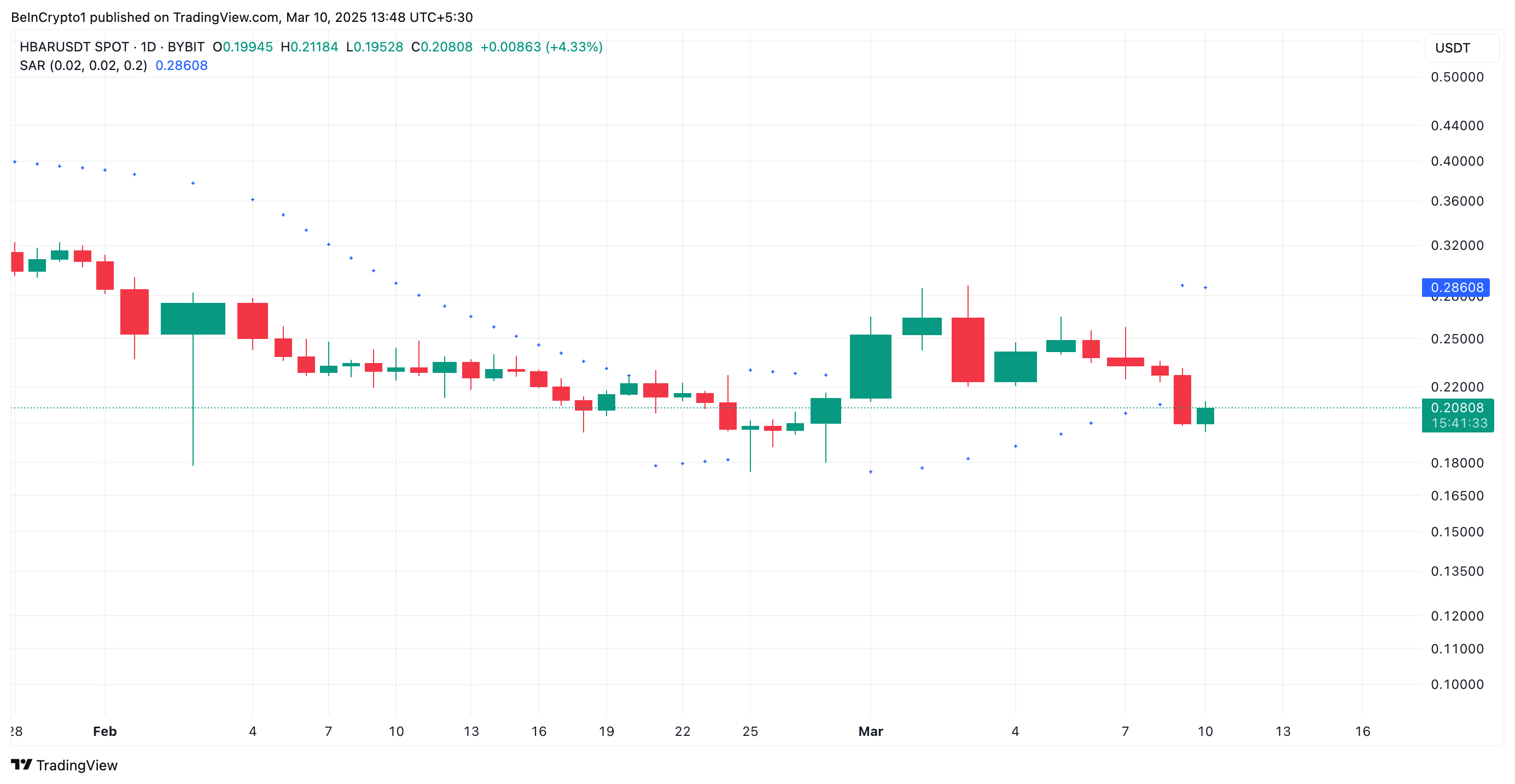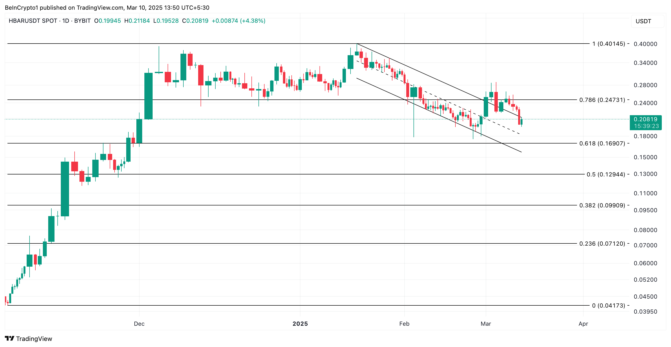 在日線圖上,HBAR 已回落至下降平行通道內,該通道在 1 月 16 日至 3 月 1 日期間保持其價格處於下行趨勢。