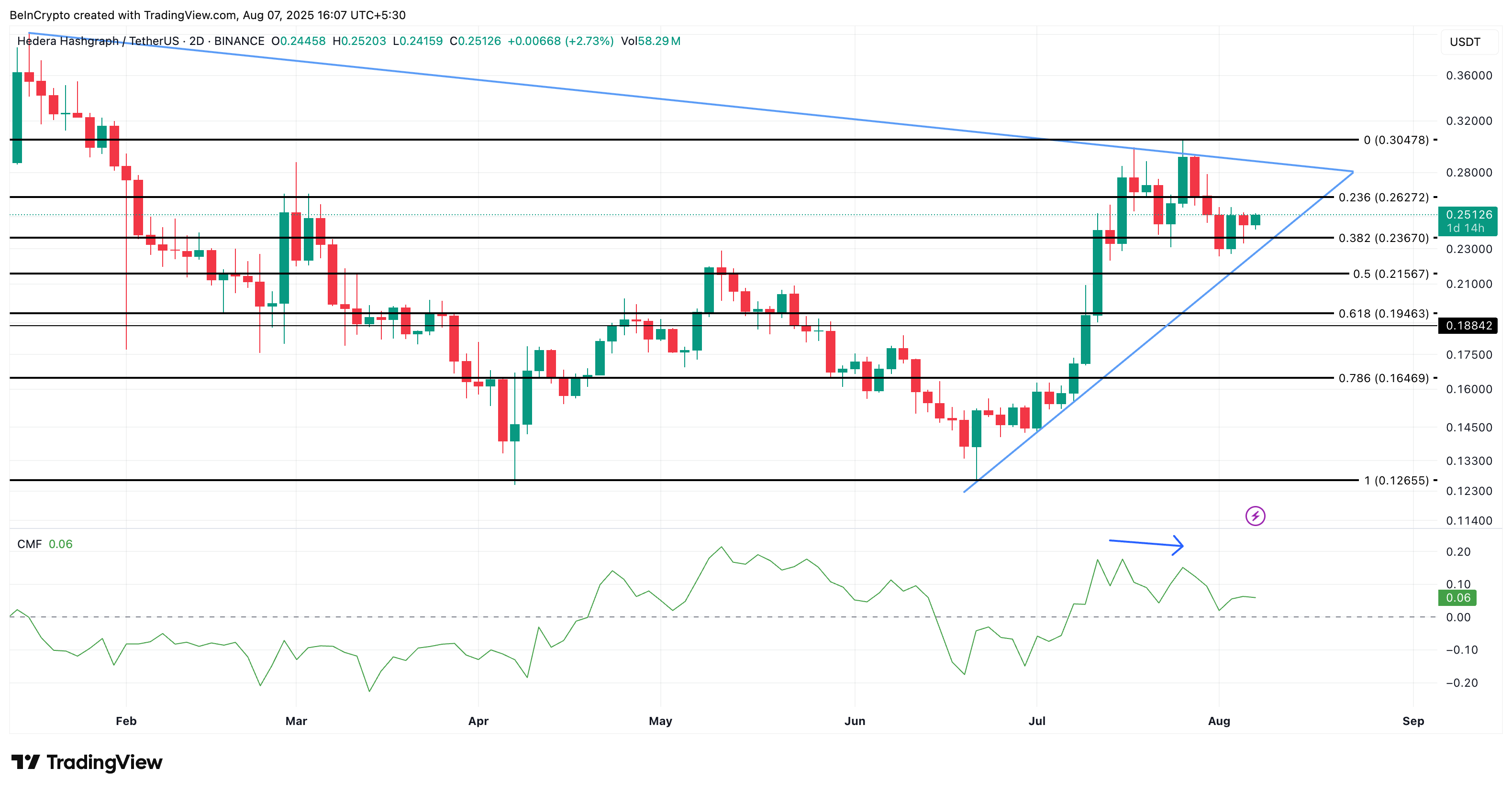 从技术面来看,HBAR 价格仍保持在 2 日图表上可见的上升趋势线上方。但已经出现了一些裂痕。Chaikin 资金流量指标(CMF)显示,尽管价格尝试创出更高点,但资金流入动能却在走低。