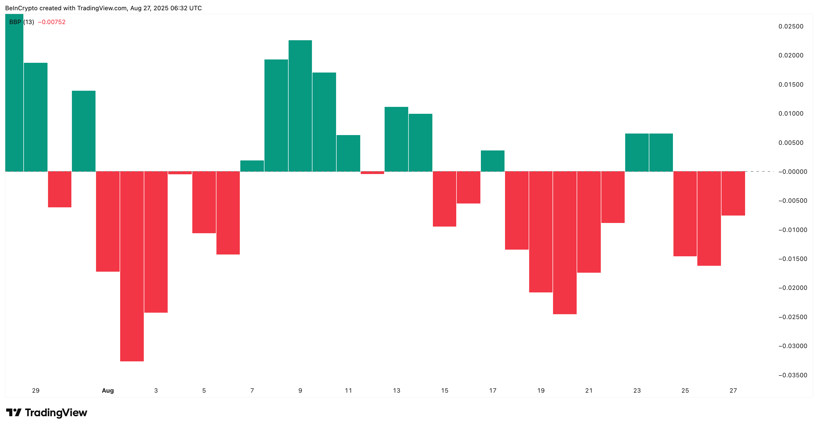 牛熊力量(BBP)指标用于比较多头力量与空头压力,该指标也显示出改善迹象。从 8 月 26 日到 27 日,空头动能有所下降,这与 8 月 15 日至 16 日和 8 月 21 日至 22 日的下降情况类似。