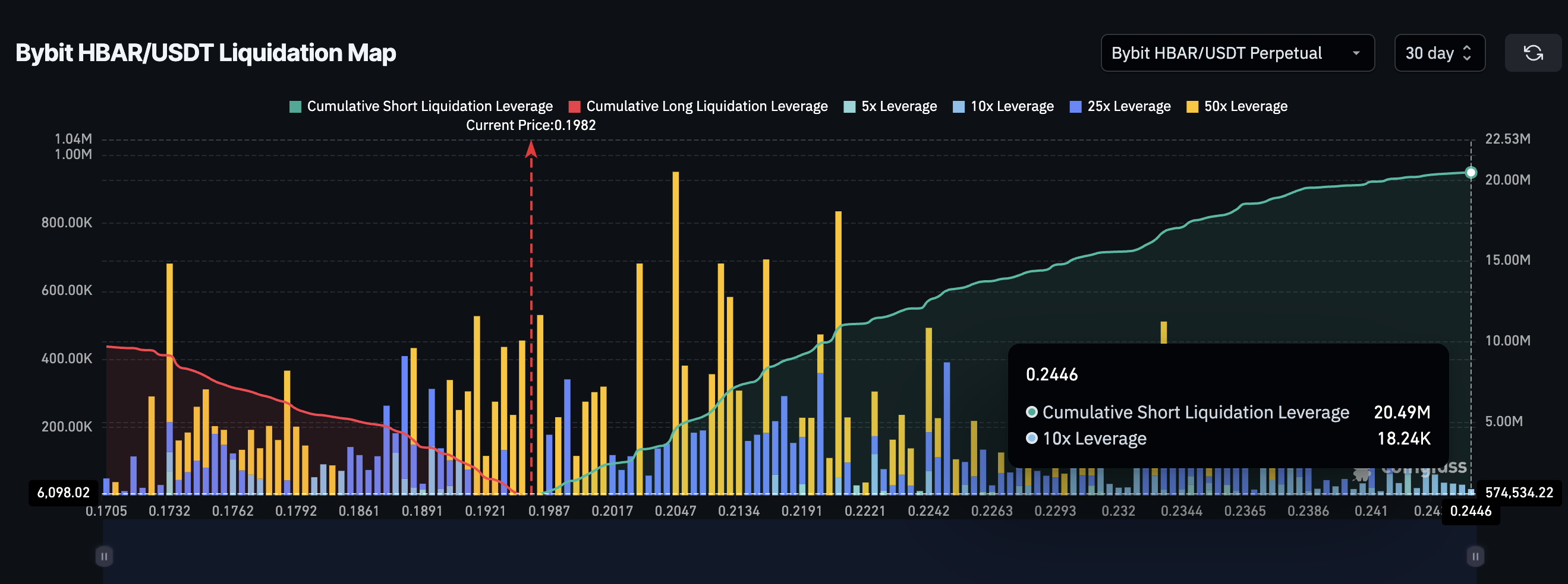 空头的清算从 0.198 美元附近开始。若 $HBAR 价格上破该水平,可能引发空头被动回补,触发空头挤压(short squeeze),从而迅速推高价格。按图示,一旦 $HBAR 突破 0.219 美元,大部分空头将被清空。
