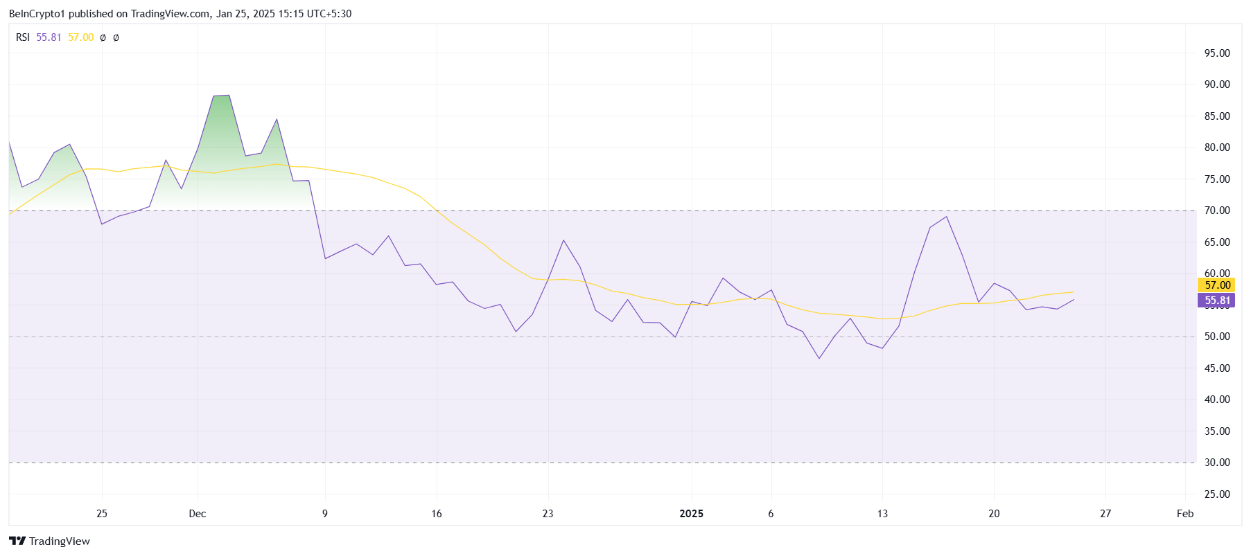 儘管看跌情緒,HBAR 的相對強弱指數(RSI)仍高於中性 50.0 水平。這表明更廣泛的市場動能仍偏向看漲趨勢,為抵禦看跌壓力提供潛在緩衝。RSI 的位置顯示 HBAR 仍保有一定的內在強度。