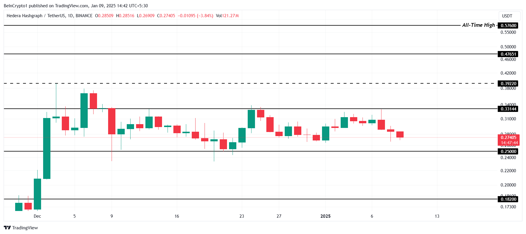 HBAR 目前交易價格為 0.27 美元,陷入 0.25 美元到 0.33 美元之間的月度盤整區間。這種橫向波動反映了交易者和更廣泛市場條件的猶豫不決。若無明確的情緒轉變,這種模式可能會持續。