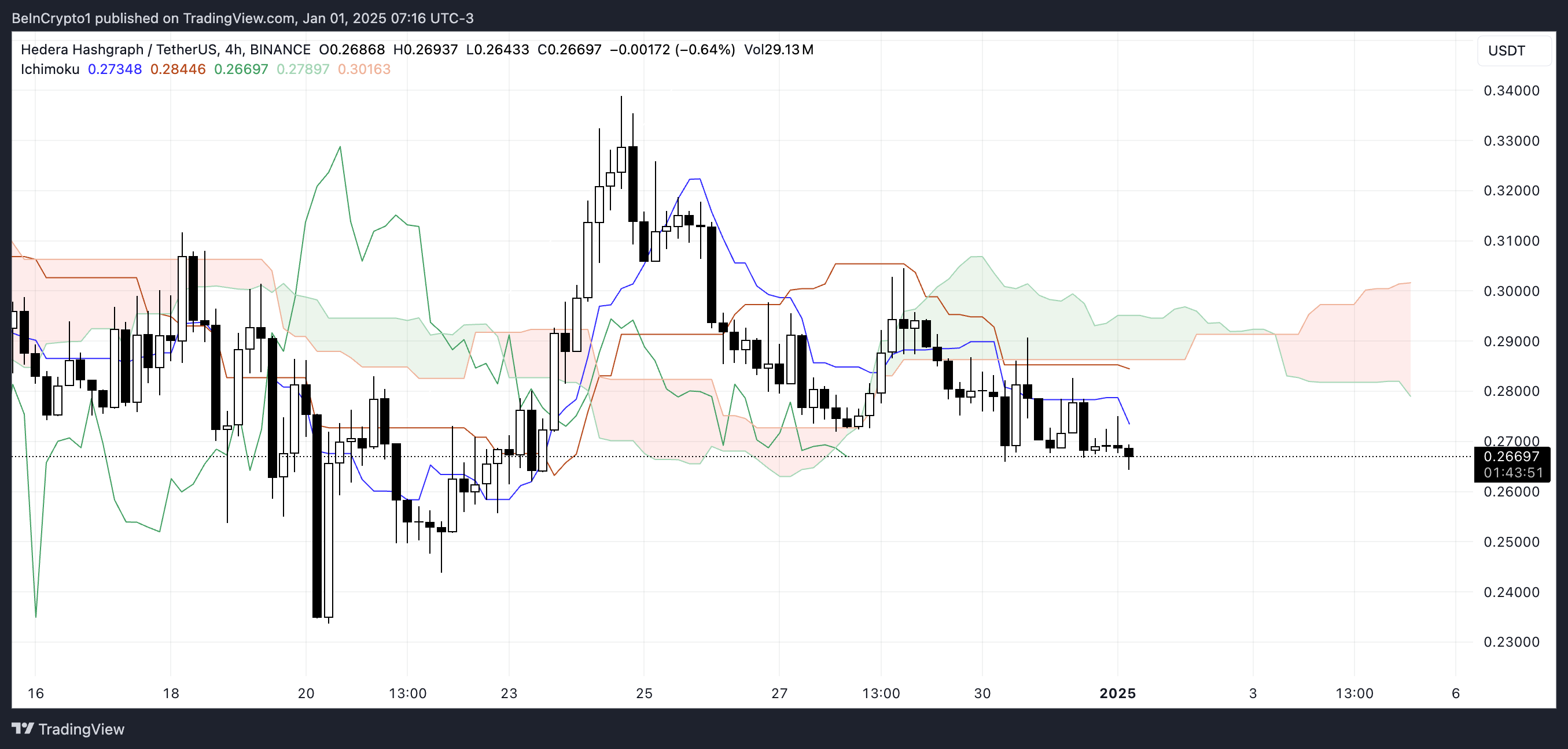 HBAR 的一目均衡圖顯示出看跌的格局,價格位於紅色雲層下方,顯示下行動能。由 Senkou Span A 和 Senkou Span B 形成的雲層加強了看跌情緒,因為 Senkou Span A 仍低於 Senkou Span B。