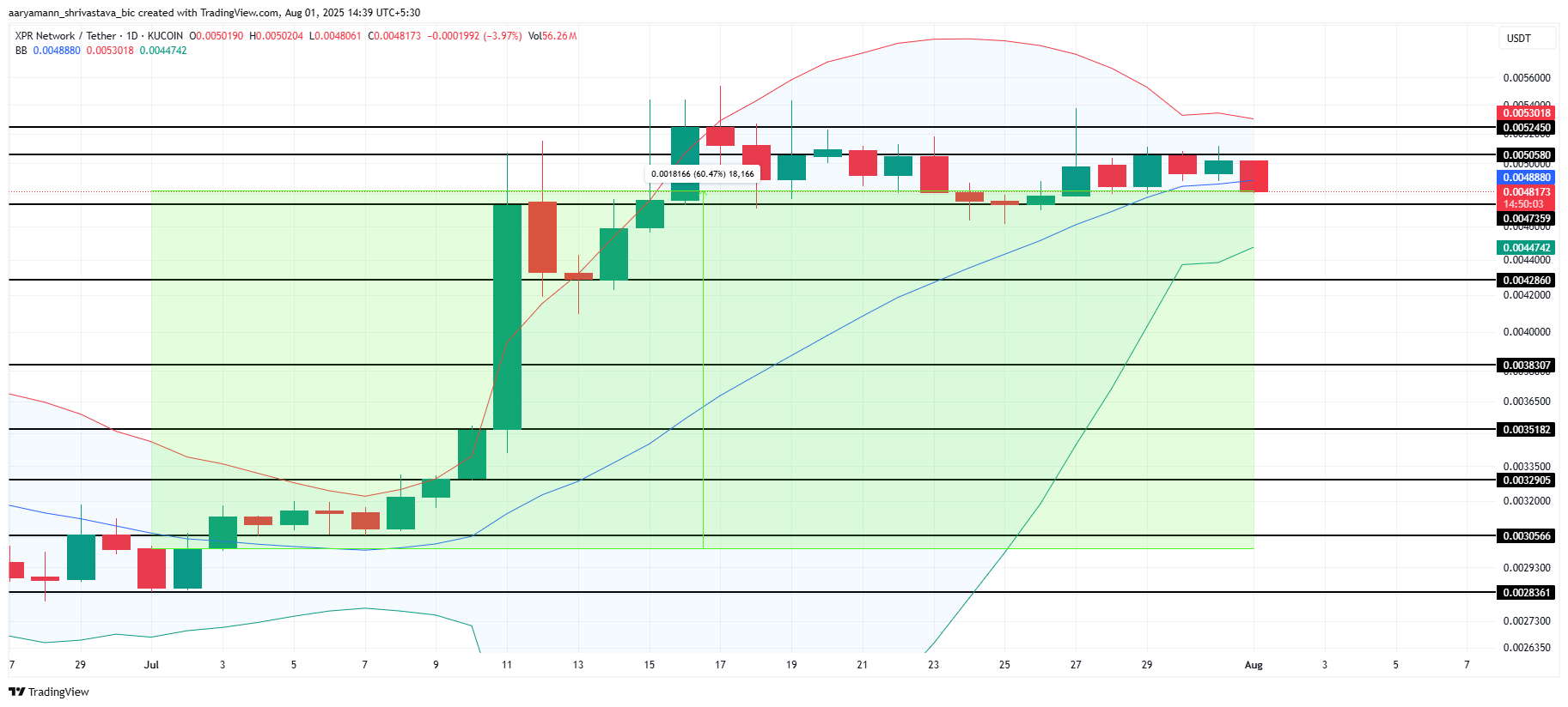布林带目前正在收敛,表明 XPR 正在为一次显著的波动性突破做准备。这一模式暗示该代币可能在未来几天内出现大幅波动。如果市场保持看涨,XPR 可能突破 $0.00505 和 $0.00524,向 $0.00600 推进。