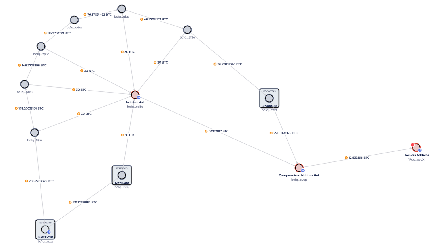 这种技术使资金追踪变得困难,常用于掩盖资金来源。在 Nobitex 的案例中,分析师发现比特币以每次 30 枚的固定模式循环转移。
