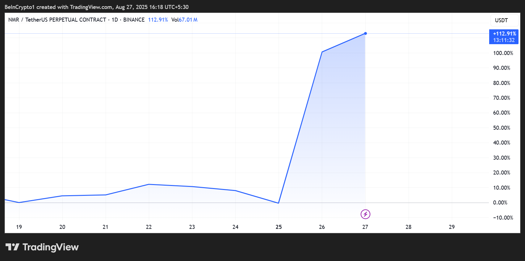 这一消息引发了 NMR 市场的热潮。该代币在短短七天内飙升 125%,24 小时交易量接近 5 亿美元。
