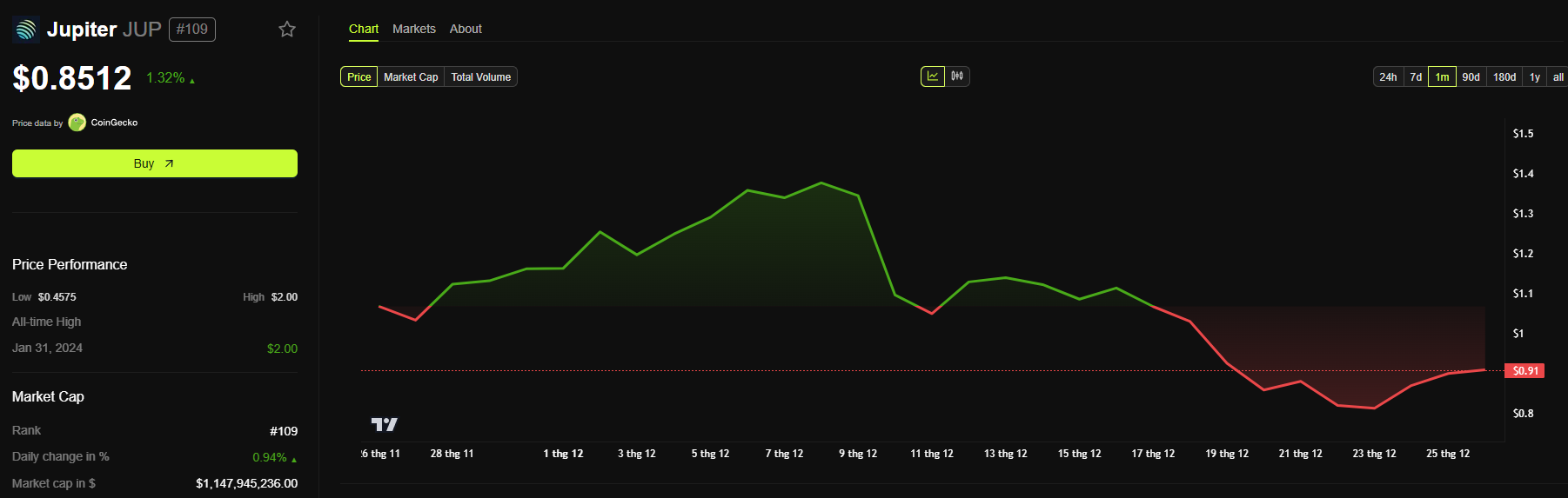 然而,目前 JUP 的交易價格約為 $0.85,自第二次空投標準公佈以來,價格沒有顯著變化。