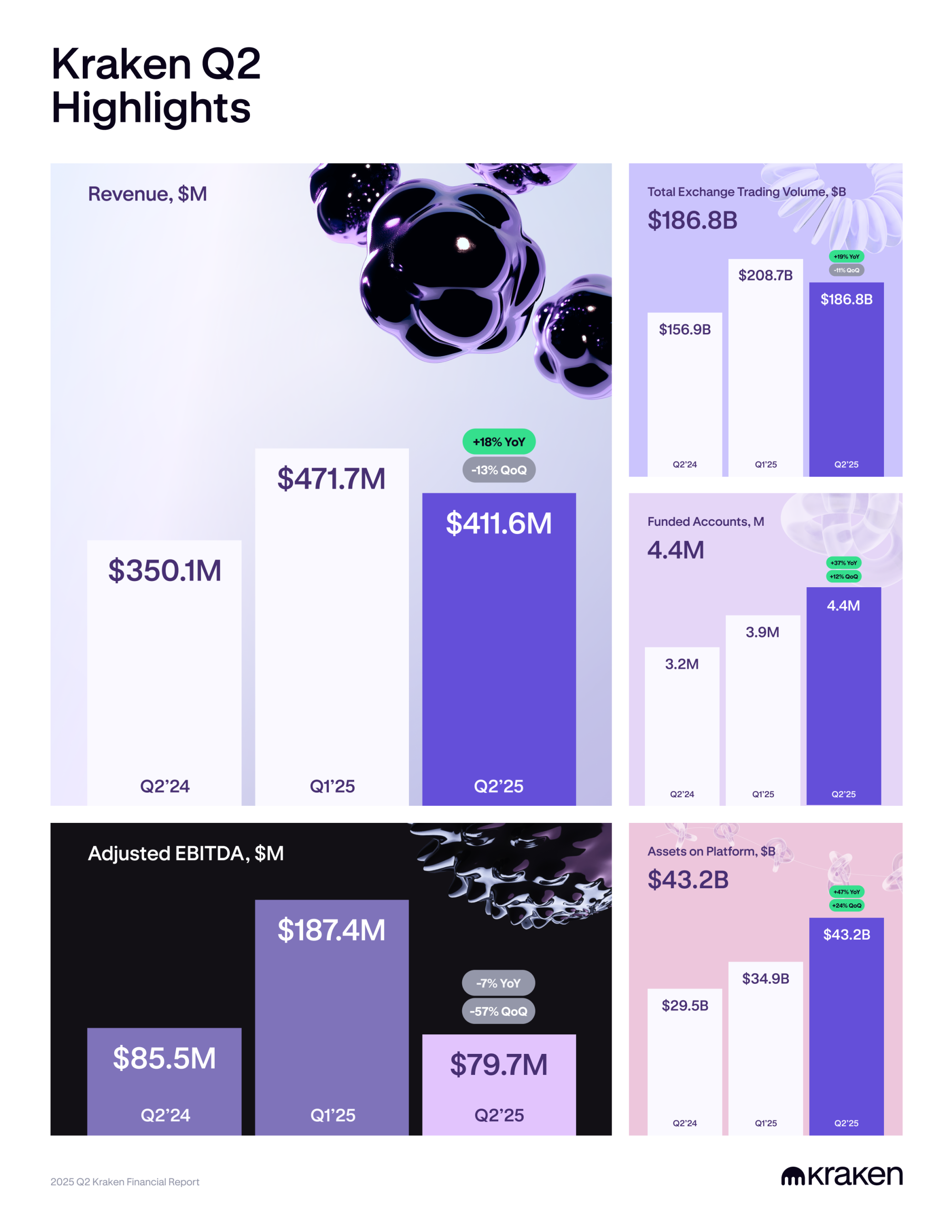 尽管面临挑战,Kraken 在多个关键领域表现强劲。截至第二季度末,平台资产增长至 432 亿美元,同比增长 47%,较上一季度增长 24%。