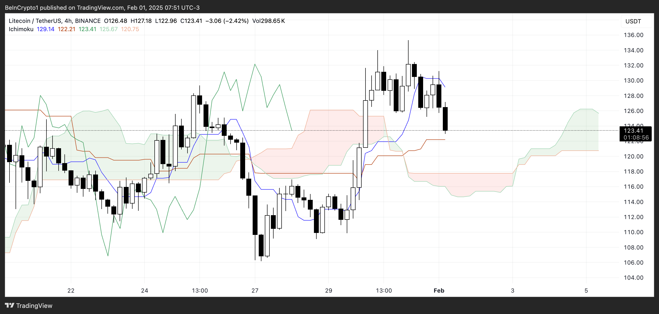 前方的雲層(Kumo)為綠色,顯示整體趨勢仍然正面,但目前價格在雲層邊緣附近波動,顯示不確定性。若 萊特幣價格 在 120 美元至 126 美元之間找到支撐,可能會穩定並嘗試恢復強勢。