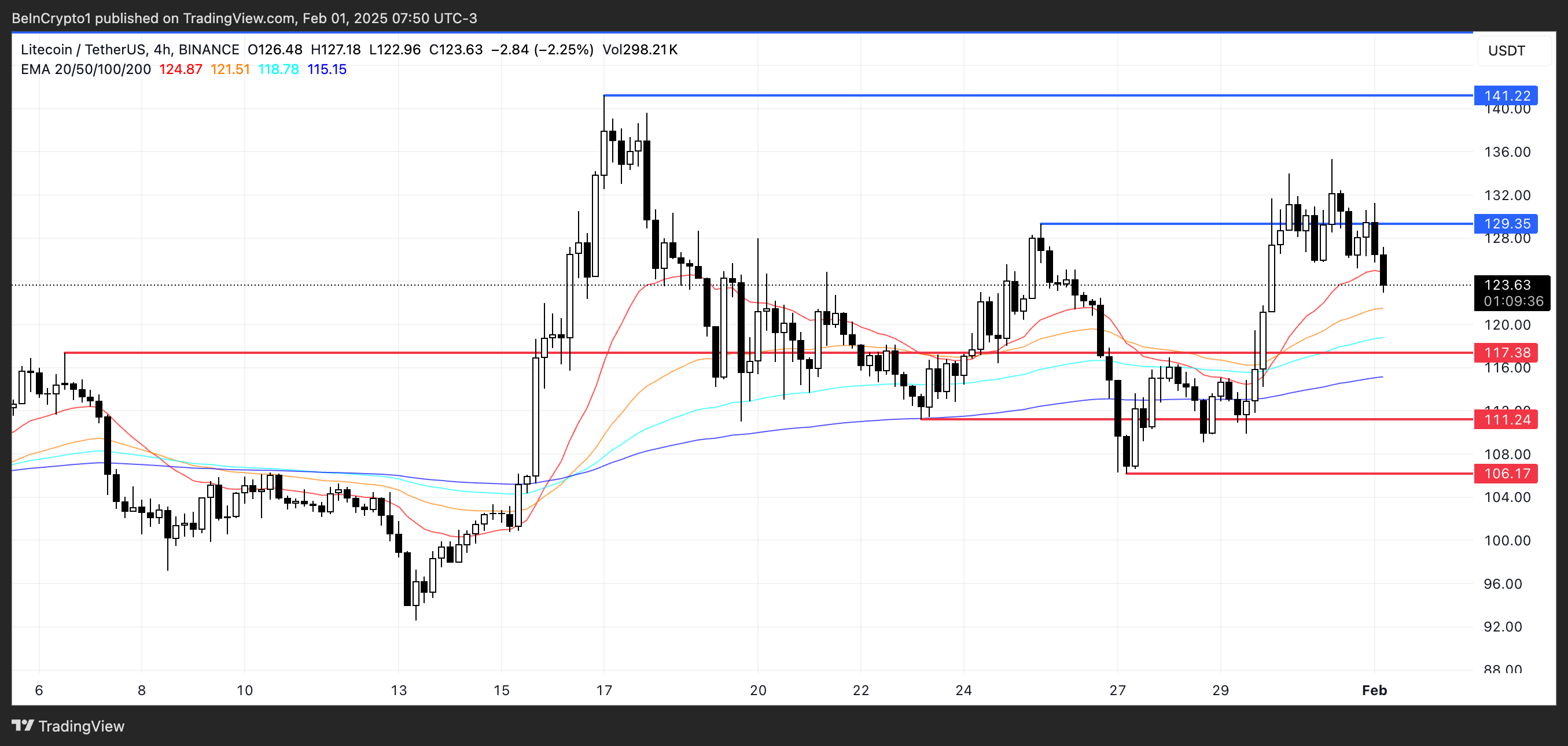 若跌破長期 EMA,將形成死亡交叉,這是一個看跌信號,可能導致進一步下跌。在這種情況下,LTC 價格 可能會測試 117 美元的支撐。