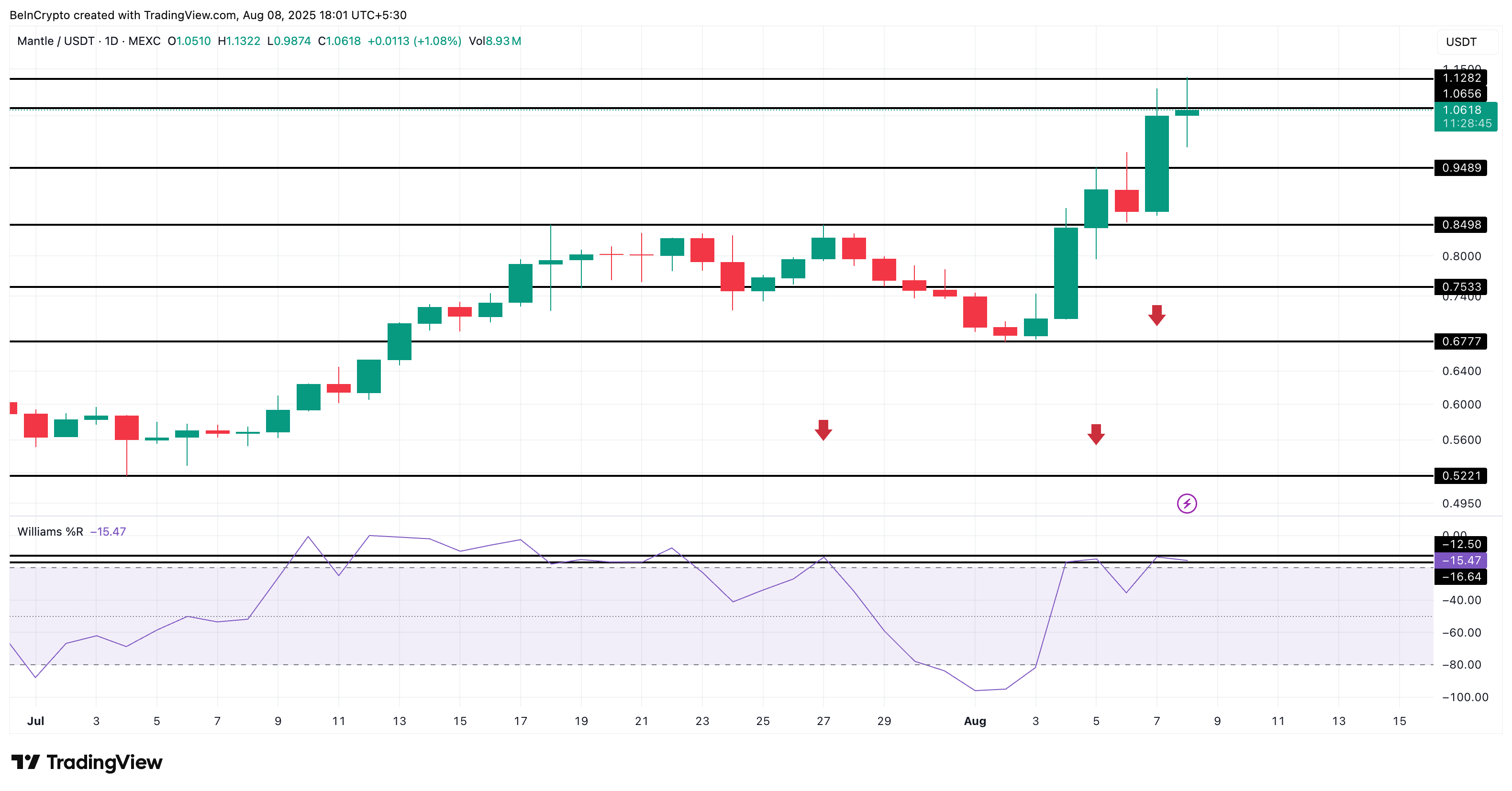 在 8 月 4 日至 5 日期间,Mantle 价格上涨至超过 0.94 美元(局部高点)。Williams %R 在此也形成了一个局部高点,但低于 7 月 27 日的高点。这意味着 $MNT 随后进入了横盘整理阶段,而非修正阶段。