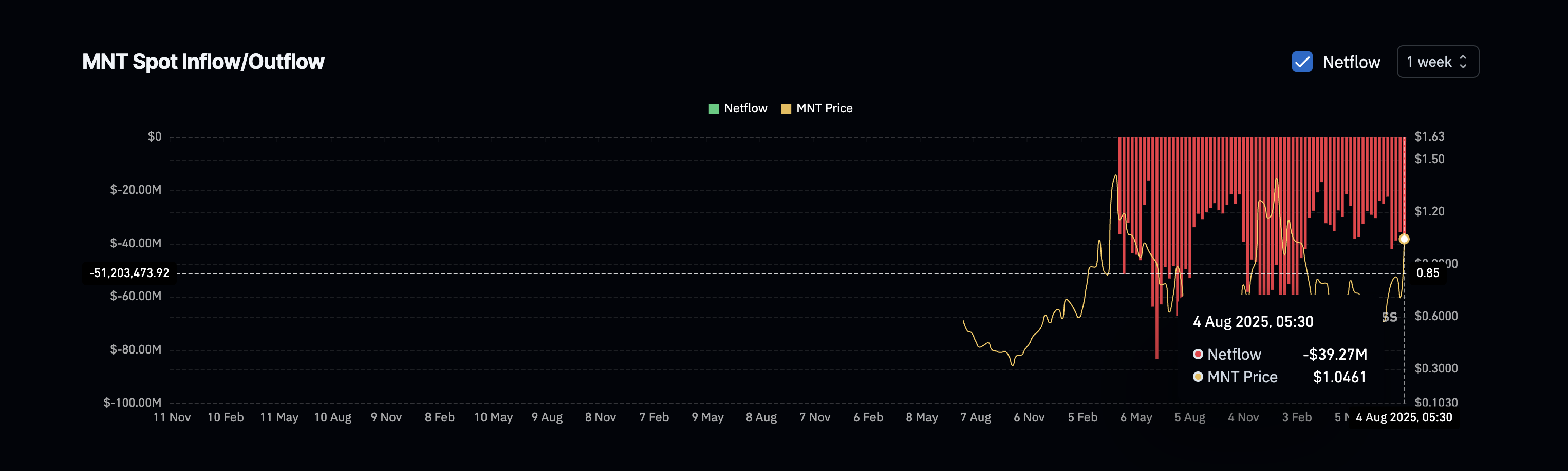 如果这种模式重演,$MNT 可能会再次触及 0.94 美元或 0.84 美元,然后再进行下一次重大走势。然而,如果获利回吐开始,且净流量转为正(表明代币流入交易所),回调可能会更陡峭。跌破 0.67 美元将使看涨结构失效。