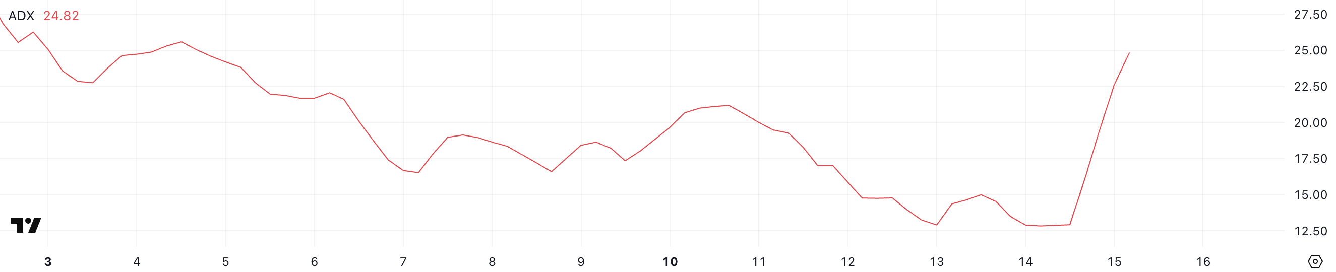 ADX 是一個關鍵指標,衡量趨勢強度,值低於 20 表示弱或無趨勢狀態,而 20 到 40 之間的讀數則表明趨勢正在鞏固。OM ADX 目前為 24.8,趨勢正在加強,但尚未達到極端水平。
