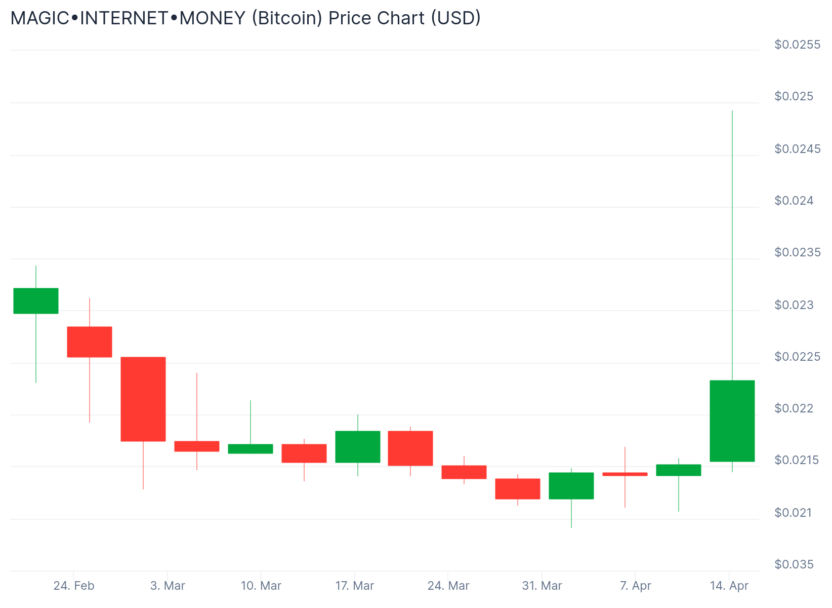 儘管近期有所回落,MIM 在過去一週仍上漲了 64%。作為比特幣上的迷因幣,其獨特定位增加了吸引力,尤其是在迷因幣擴展至不同區塊鏈生態系統的趨勢下。這一趨勢顯示出投資者對此類資產的興趣和投機活動正在增長。