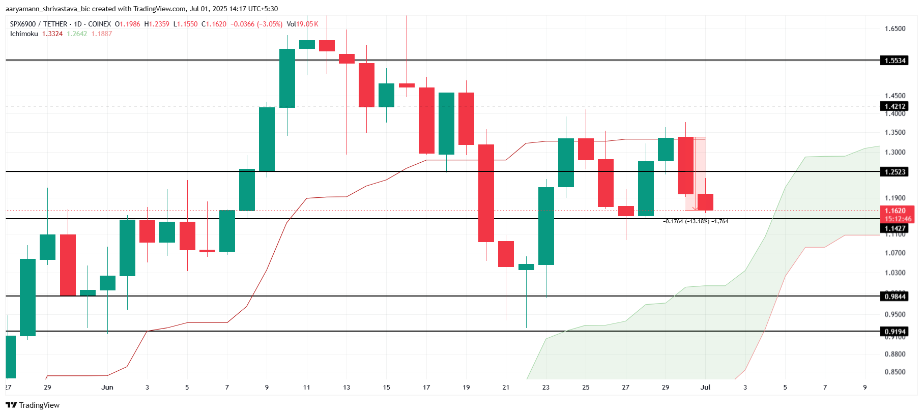 然而,如果 SPX 无法维持 1.14 美元的支撑位,该迷因币可能跌至 0.98 美元。这将使看涨论点失效,并导致 SPX 进一步下跌。