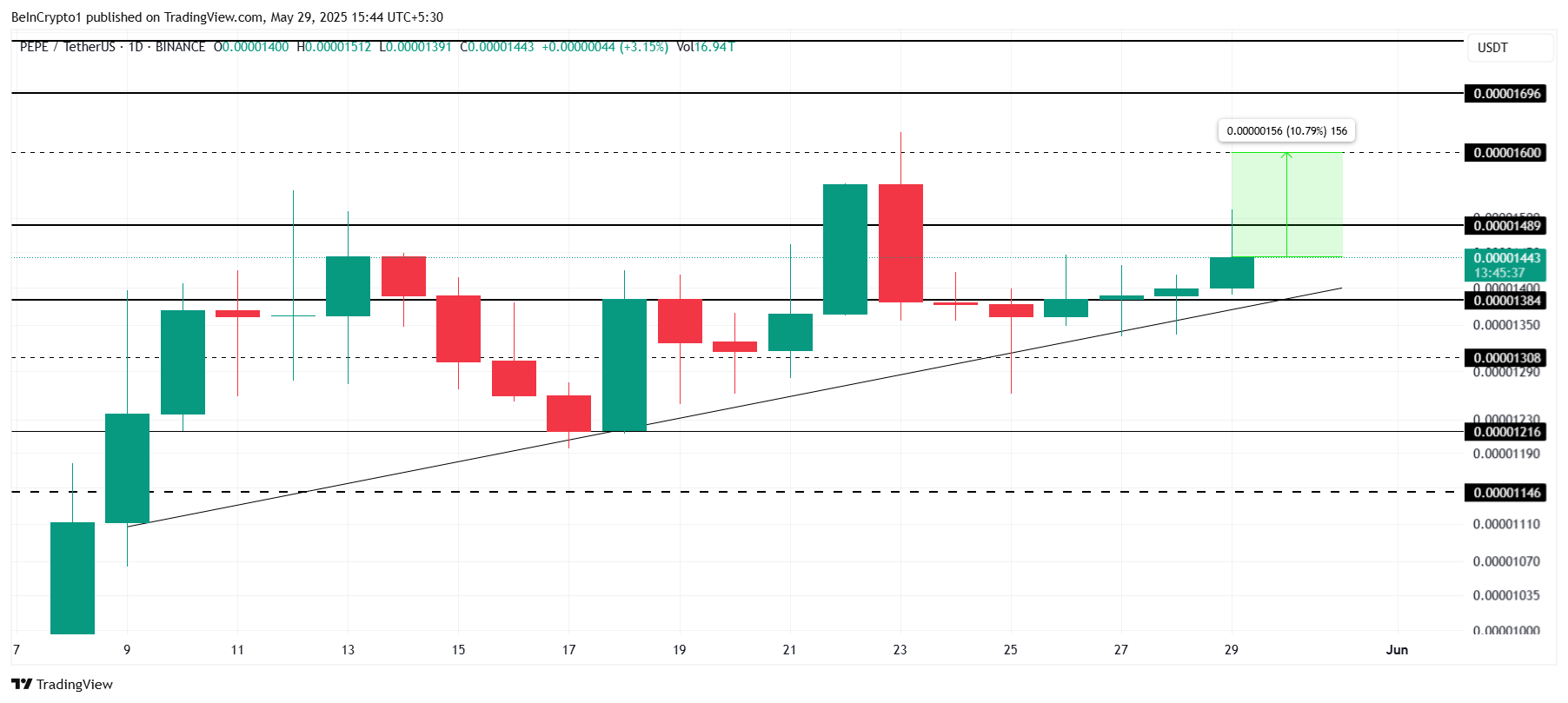 若上升動能持續,PEPE 可能突破 $0.00001489。此突破可能引發 10.79% 的上漲,將價格推升至 $0.00001600,確認持續的上升趨勢強度。