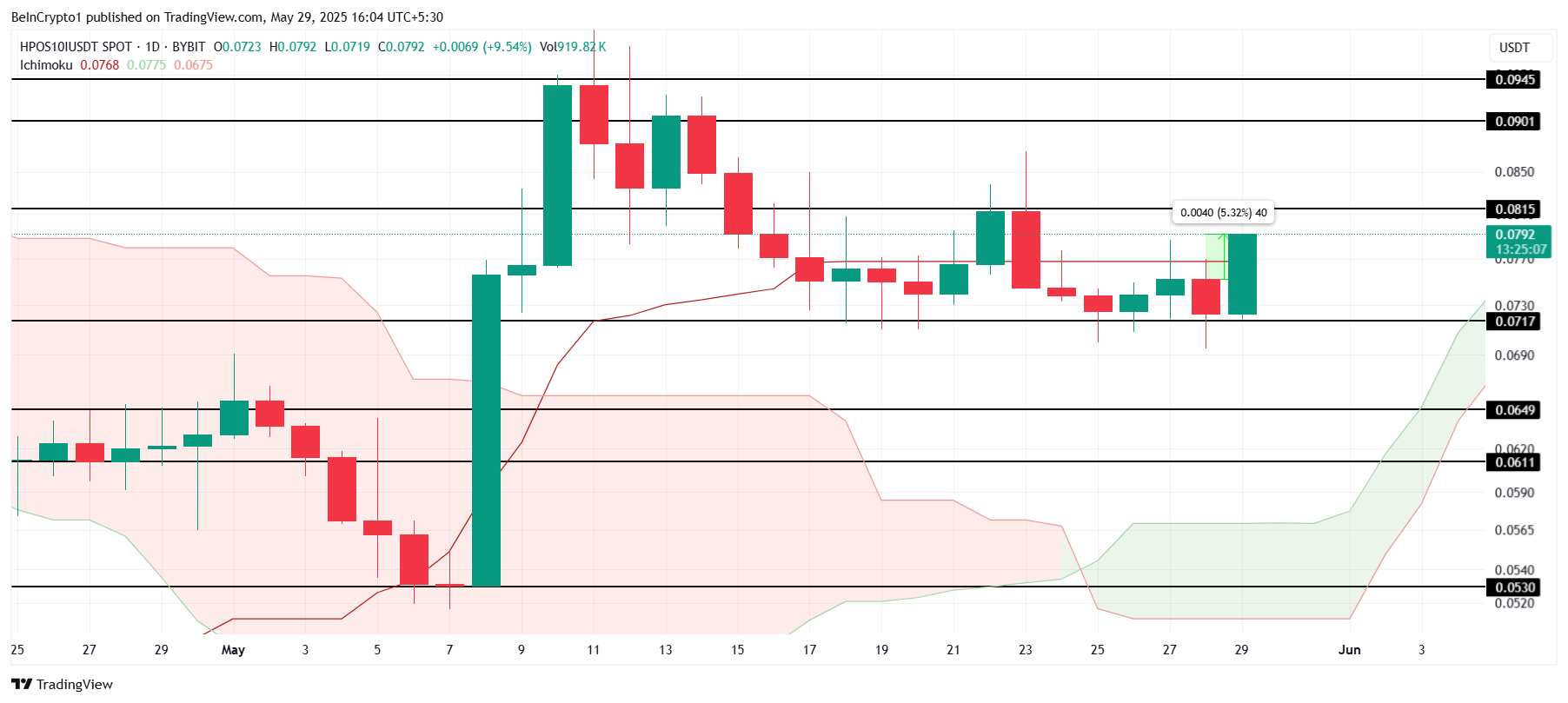 迷因幣 BITCOIN 最近上漲了 5.3%,一目雲圖位於蠟燭圖下方,顯示出持續的看漲動能。這表明價格在短期內可能維持上升趨勢。