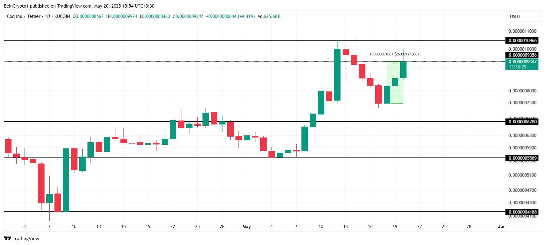 COQ 成為當日表現最佳的代幣,上漲 13%。這枚迷因幣在過去兩天已上漲 25%。目前交易價格為 0.000000934 美元,COQ 正在測試 0.000000935 美元的關鍵阻力位,若保持動能,可能突破至更高水平。