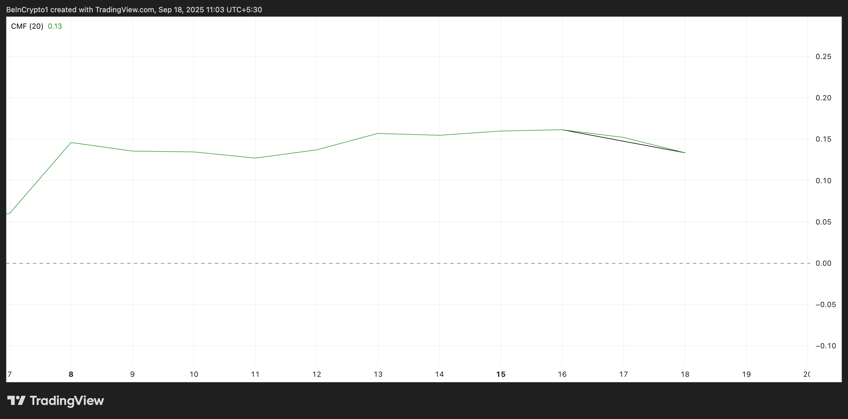 此外,自 9 月 16 日以来,M 币的 Chaikin 资金流量指标(CMF)呈下降趋势,与代币价格的上涨形成了看跌背离。