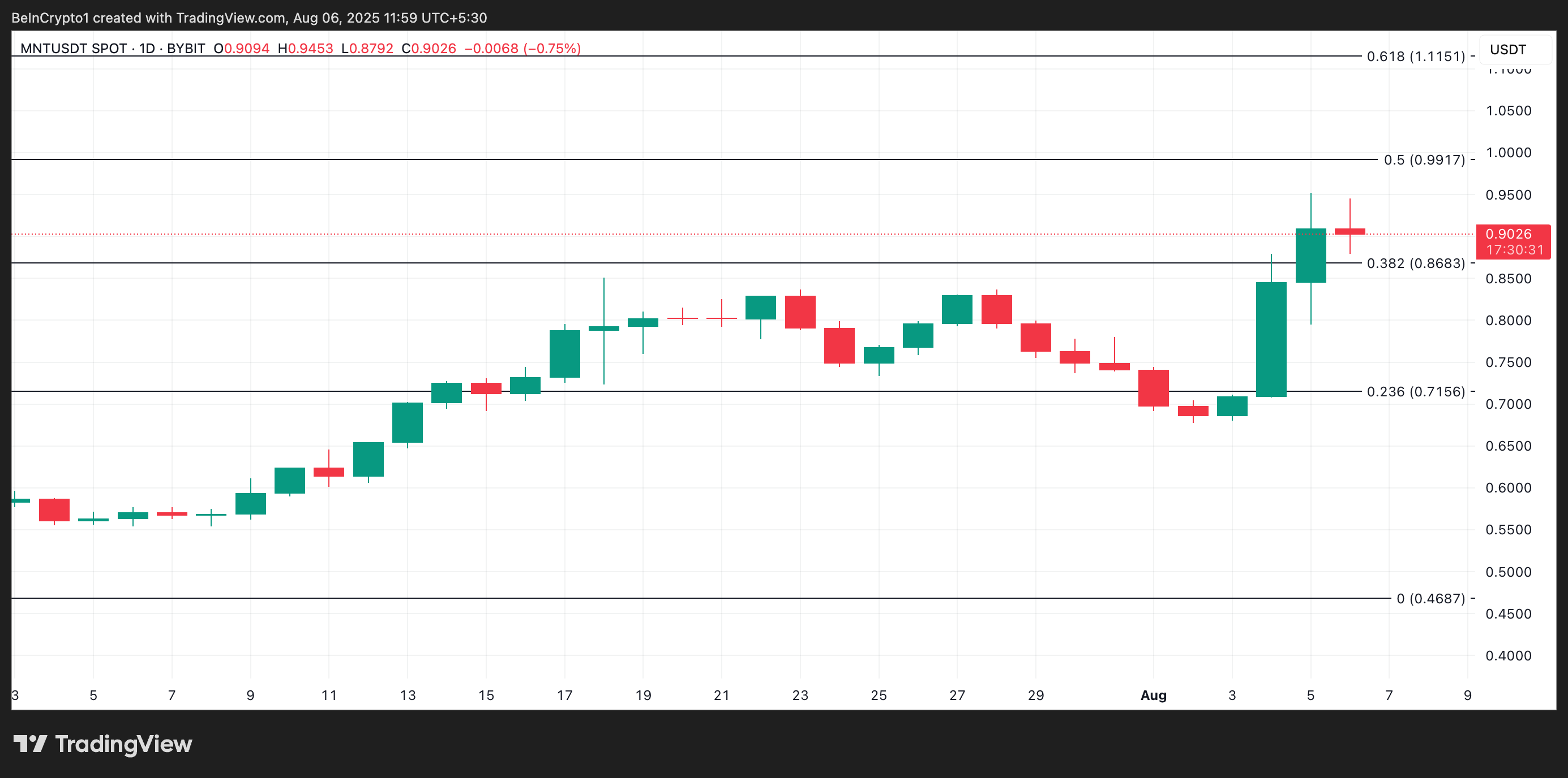 另一方面,如果获利回吐重新开始,MNT 可能会失去动能,并尝试测试新的 $0.86 支撑位。如果未能守住,该代币的价格可能会跌至 $0.71。