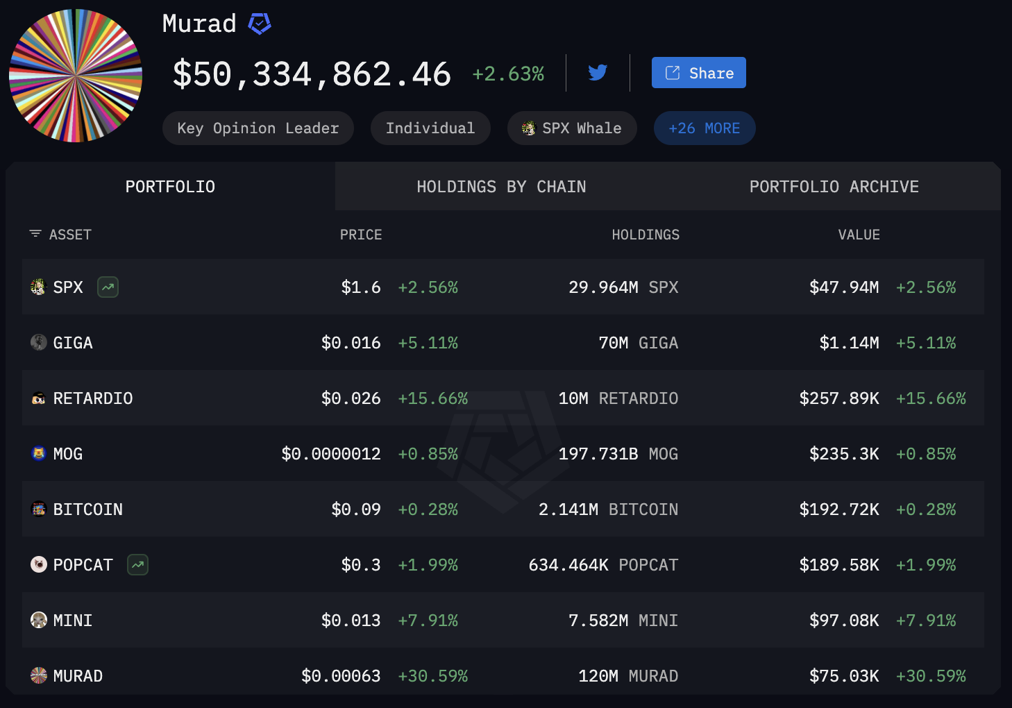 他对较早发行代币的信心与其投资组合相符,该组合最近接近历史高点,据 BeInCrypto 报道。根据区块链分析平台 Arkham Intelligence 的数据,Murad 价值最高的持仓包括 SPX6900($SPX)、Gigachad($GIGA)和 Retardio($RETARDIO),这些都是 2023 年至 2024 年间发行的较早迷因币。