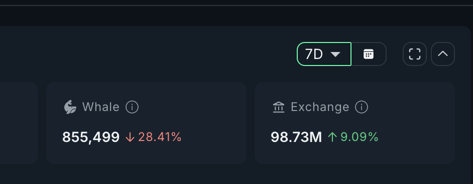 交易所也吸收了新的供应,余额增加了 823 万枚 MYX,总计达到 9,873 万枚代币——按当前价格计算约为 1.436 亿美元。交易所余额的增加通常表明持有者准备出售,增加了供给侧压力。