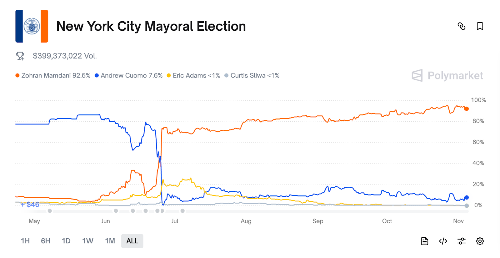 在选举日当天,曼达尼有 92% 的概率赢得纽约市市长选举,Polymarket 上的交易量超过 4 亿美元。