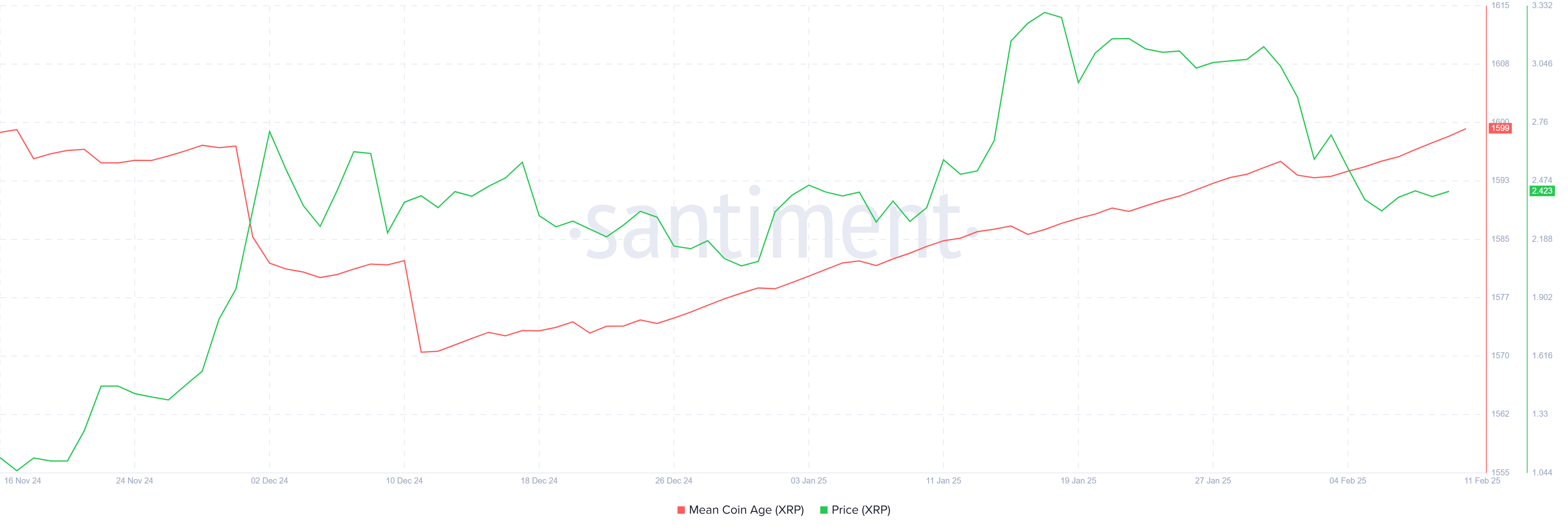 XRP 的宏觀動能顯示出穩定跡象,平均幣齡(MCA)指標持續上升。這一增長表明長期持有者(LTHs)選擇持有而非在下跌期間出售。LTHs 通常被視為任何資產的支柱,他們的持有決定在穩定價格方面發揮關鍵作用。