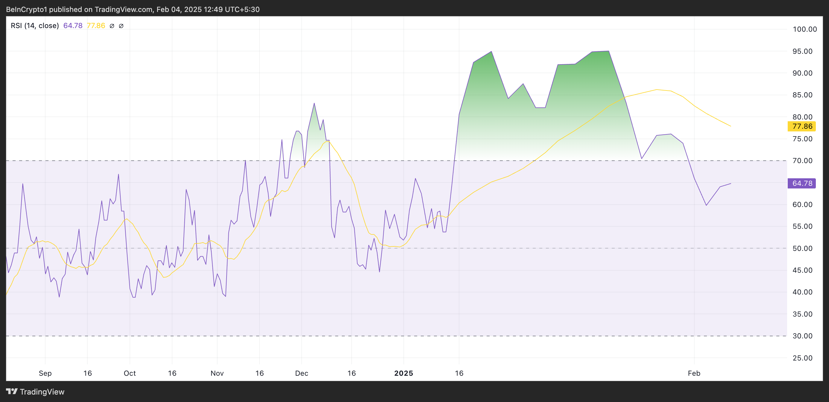此指標衡量資產的超買和超賣市場狀況。範圍在 0 到 100 之間,超過 70 表示資產超買,可能需要修正。相反,低於 30 則表示資產超賣,可能會反彈。