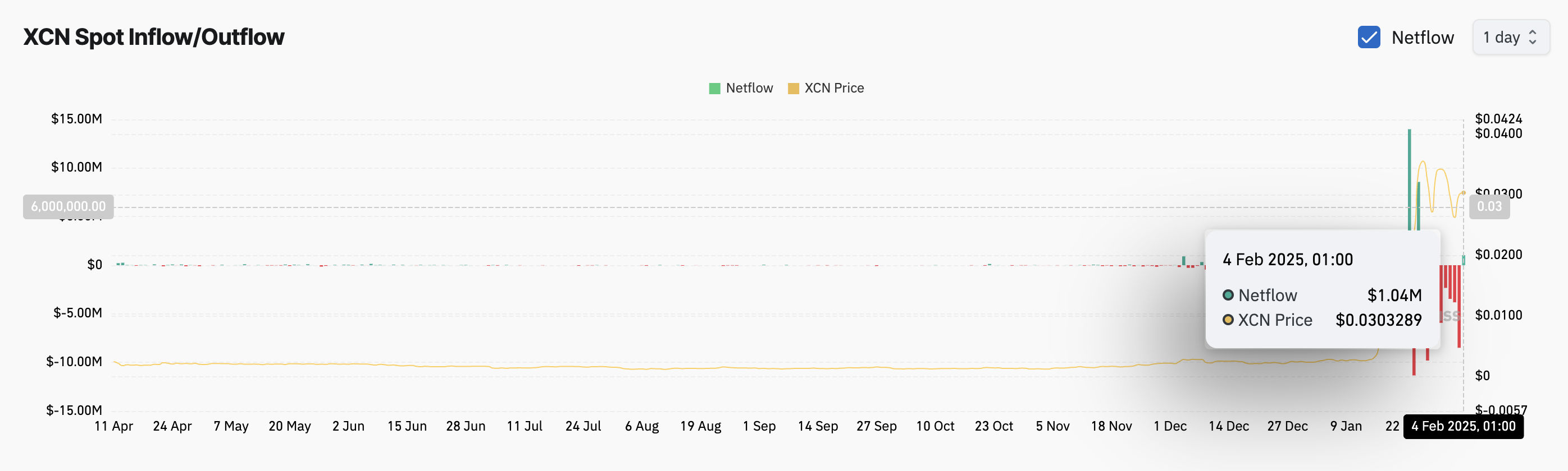 值得注意的是,XCN 自 1 月 27 日以來首次錄得現貨流入。根據 Coinglass,目前為 1.04 百萬美元,反映市場的買入活動。
